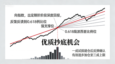 斐波那契0.5比例被誉为抄底“黄金分割点”,支撑与压力均衡,适配多数震荡市,是适用性最广的比例。何青平建议,无论牛熊震荡,指数回调至0.5位置且市场情绪平稳、无重大利空时,可采用“一成试探+一成补仓”策略,总仓位控制在两成。该位置信号明确,跌破则果断止损,站稳反弹可加仓至三成,实现收益与风险平衡。