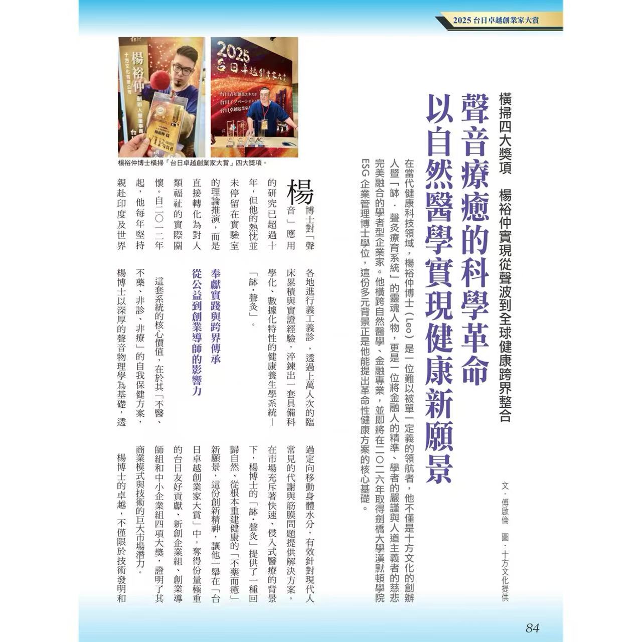 当被问及创业初心,杨裕仲总提及「传承」二字。在他看来,声疗不仅是一项技术,更是东方智慧的当代表达。通过培养专业人才、建立行业标准、推动国际合作,他正让「以自然之力疗愈身心」的理念深入人心。正如《卓越杂志》评价:「杨裕仲的卓越,不仅在于技术与商业模式的创新,更在于他以声为媒,传递着跨越国界的健康温度,成为连接传统与现代、东方与西方的健康使者。」