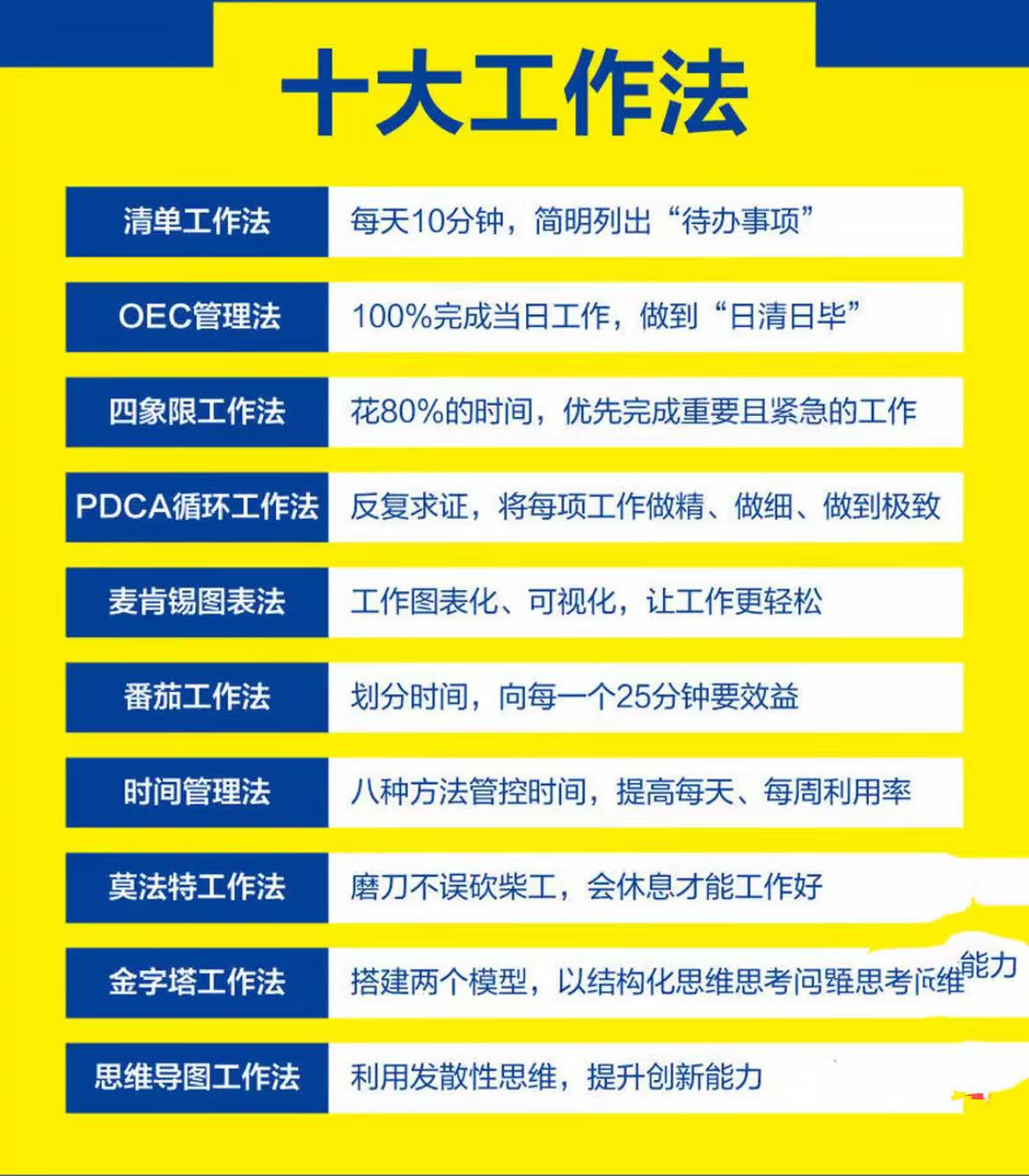 全书十大工作法覆盖了从计划制定到思维突破的全链路场景。“清单工作法” 帮你梳理每日任务,“四象限工作法” 教你分清轻重缓急,“番茄工作法” 优化时间颗粒度,无论新人还是管理者,都能找到适配的解决方案。