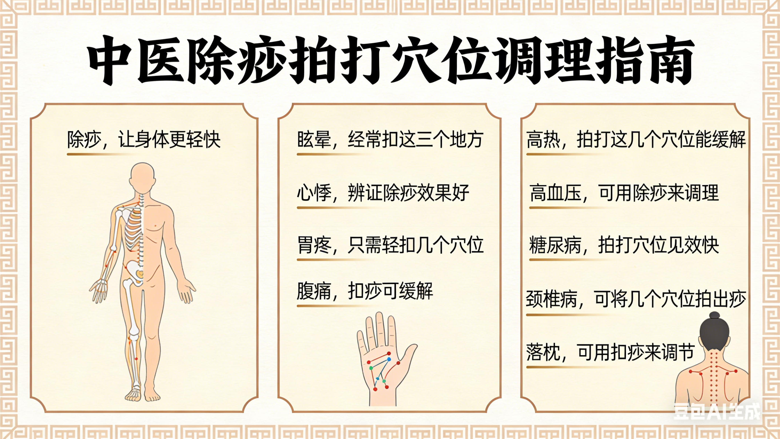 发热时,除痧可作为辅助降温方法。重点拍打曲池穴(肘横纹外侧端)与大椎穴(第七颈椎下),这些穴位有助于疏散风热。