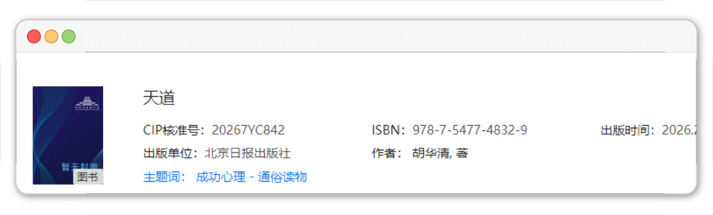 而今佳音传来,新商业文化创始人、中国青年作家胡华清先生的著作《天道》,正式斩获北京日报出版社书号,即将出版上架