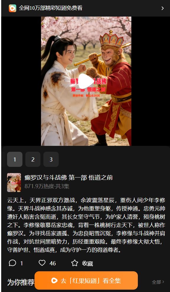 红果短视频始终致力于为观众带来多元、优质的精品内容,从都市爽剧到古风仙侠,从温情家庭到神魔传奇,丰富题材全覆盖,更以免费观看、无套路追更的模式,收获大批观众的喜爱。此次《癫罗汉与斗战佛》的上线,是红果短视频在神魔武侠赛道的又一次深耕,依托平台的传播优势与流量加持,让这部精品短剧被更多观众看见,也让神魔江湖的热血与哲思,走进更多人的视野。