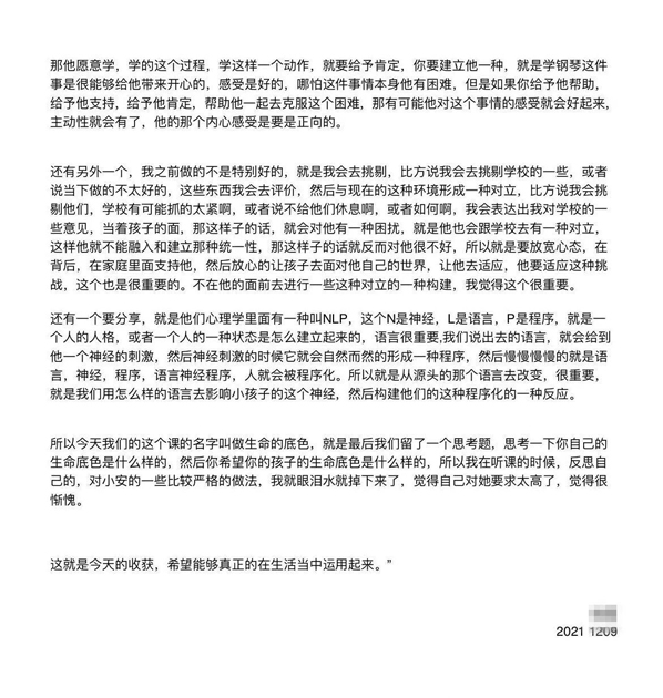 已经有很多母亲、父亲、孩子在课堂上受益。一些朋友将这些感悟发在群里,正是课堂最好的延伸。