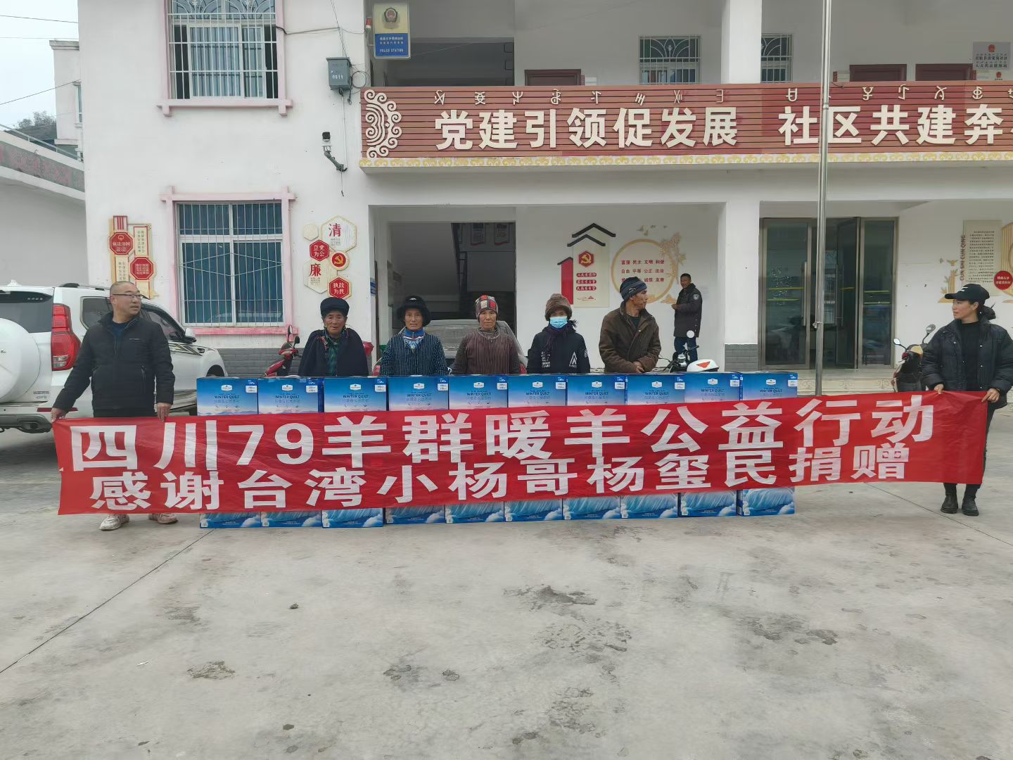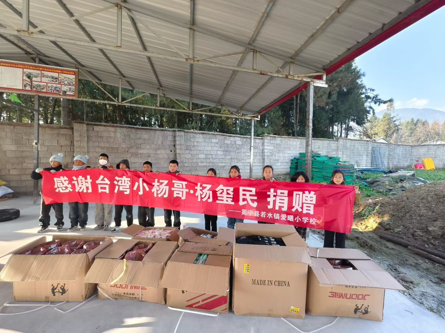 在若水镇的村落广场与爱曦小学的操场上,公益团队与当地干部共同完成了物资交接。老人们接过崭新的棉被,脸上露出了欣慰的笑容;孩子们捧着篮球、跳绳,眼中闪烁着雀跃的光芒。现场悬挂的“感谢台湾小杨哥杨玺民捐赠”横幅,成为了这场温暖传递的见证,也让善意的力量在人群中传递蔓延。