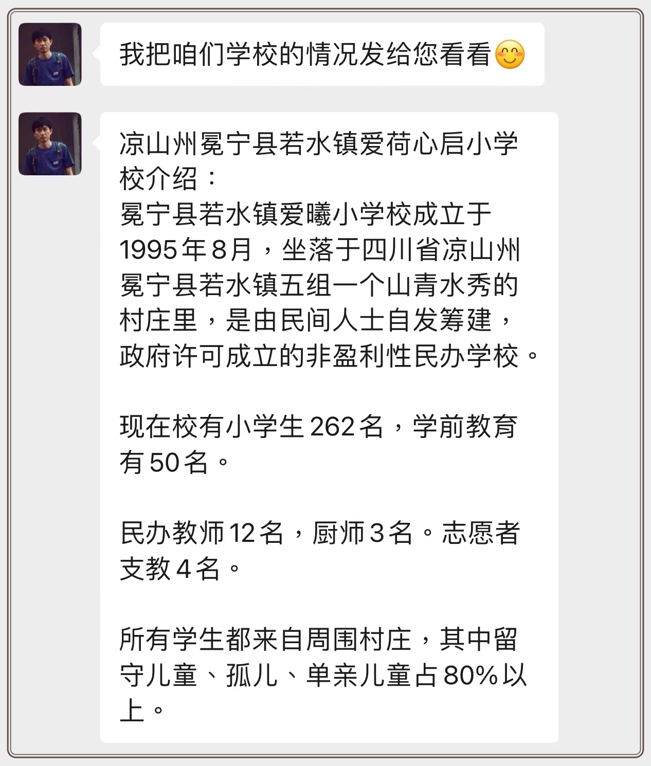 冕宁县若水镇地处偏远,当地不少村庄交通闭塞、经济薄弱。爱荷心启小学(爱曦小学)的262名小学生与50名学前儿童中,留守儿童、孤儿及单亲儿童占比超80%,他们大多缺乏家庭照料与物质保障;而留守老人则面临着生活物资匮乏、冬日御寒困难的窘境。这些真实的困境,成为了公益行动的初心锚点,也让每一份捐赠都更具分量。