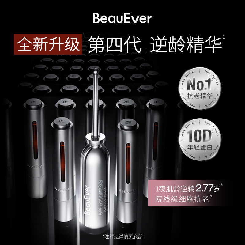 BeauEver第四代逆龄精华以「院线级细胞抗老」为核心,实现1夜肌龄逆转2.77岁的突破。产品凭借权威数据验证,抬头纹隐匿52%、鱼尾纹改善55%,苹果肌提拉27%,用直观数据打破抗老无效循环,为熟龄肌提供精准解决方案。