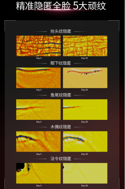 产品针对上面部、中面部、下面部定制化抗衰:上面部抬头纹、鱼尾纹分别减少52%、55%;中面部苹果肌提拉27%、鼻唇沟提拉53%;下面部下颌线紧致20%、角度优化12%,精准重塑立体轮廓。