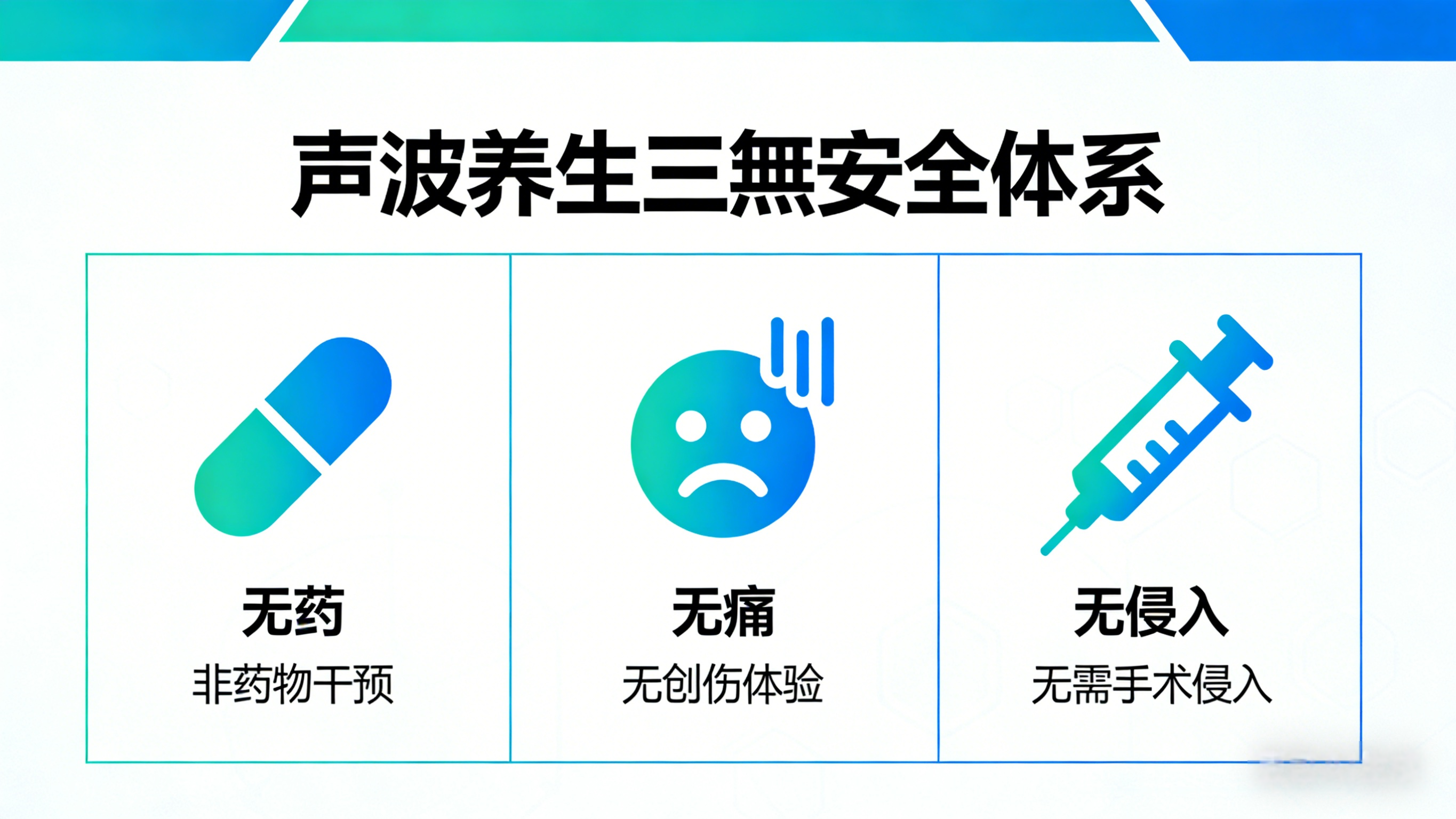 声波养生构建了“无药、无痛、无侵入”的三無安全体系,彻底消除了疾病传染风险与施治法压力。它无需依赖药物,避免了药物依赖与肝肾损伤;不产生疼痛感受,降低了用户的心理与生理负担;全程无侵入性操作,规避了手术感染与创伤风险,让健康调理变得更安全、更温和。