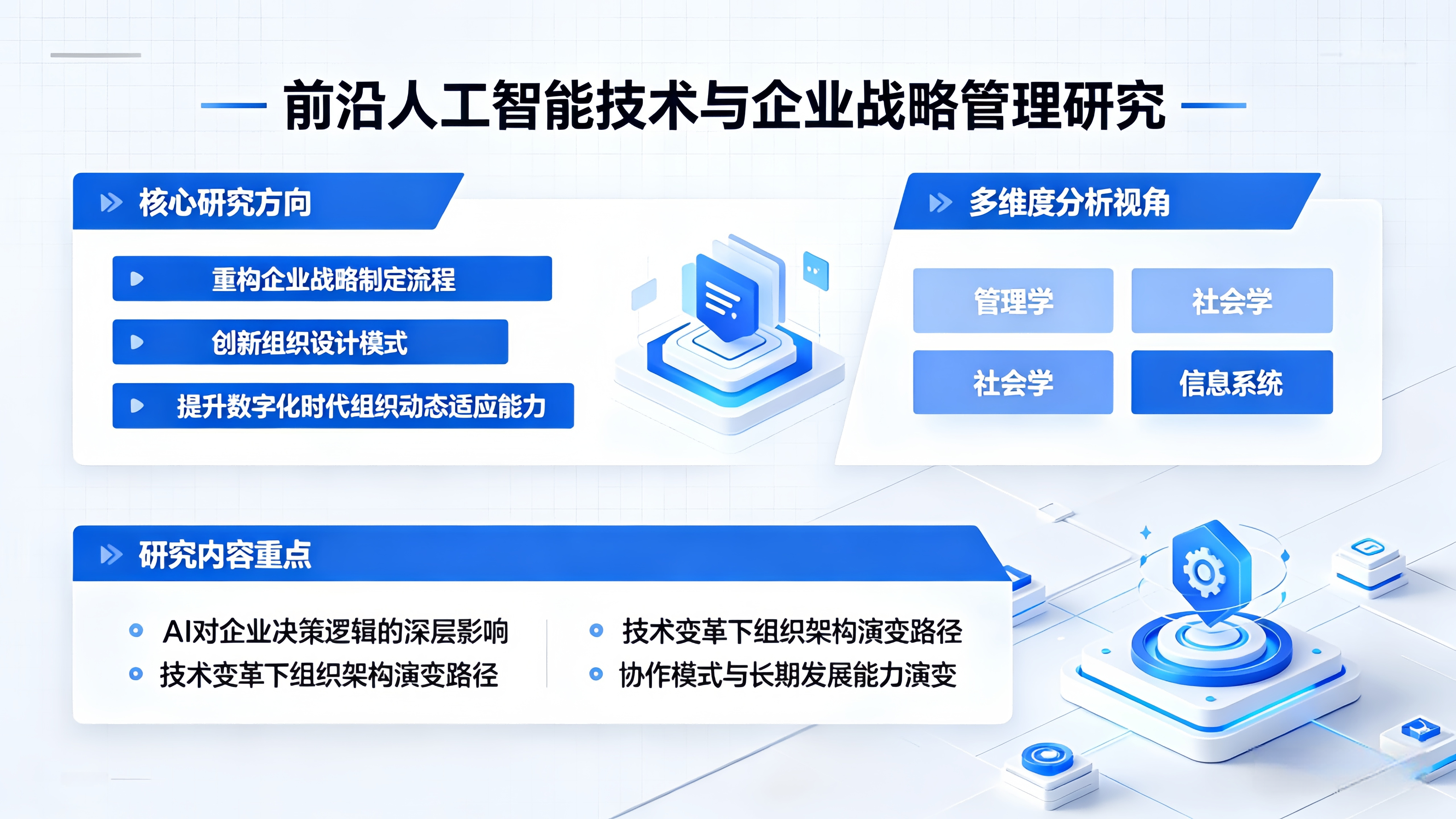 本博士项目核心研究方向,是探索前沿人工智能技术如何重构企业战略制定流程、创新组织设计模式,并提升数字化时代组织的动态适应能力。研究跳出单一技术应用视角,将AI视为重要的组织与战略现象,从管理学、社会学、信息系统等多维度展开分析,强调理论驱动与学术创新。研究内容既关注AI对企业决策逻辑的深层影响,也探讨技术变革下组织架构、协作模式与长期发展能力的演变路径,为智能时代企业战略管理提供学术支撑。