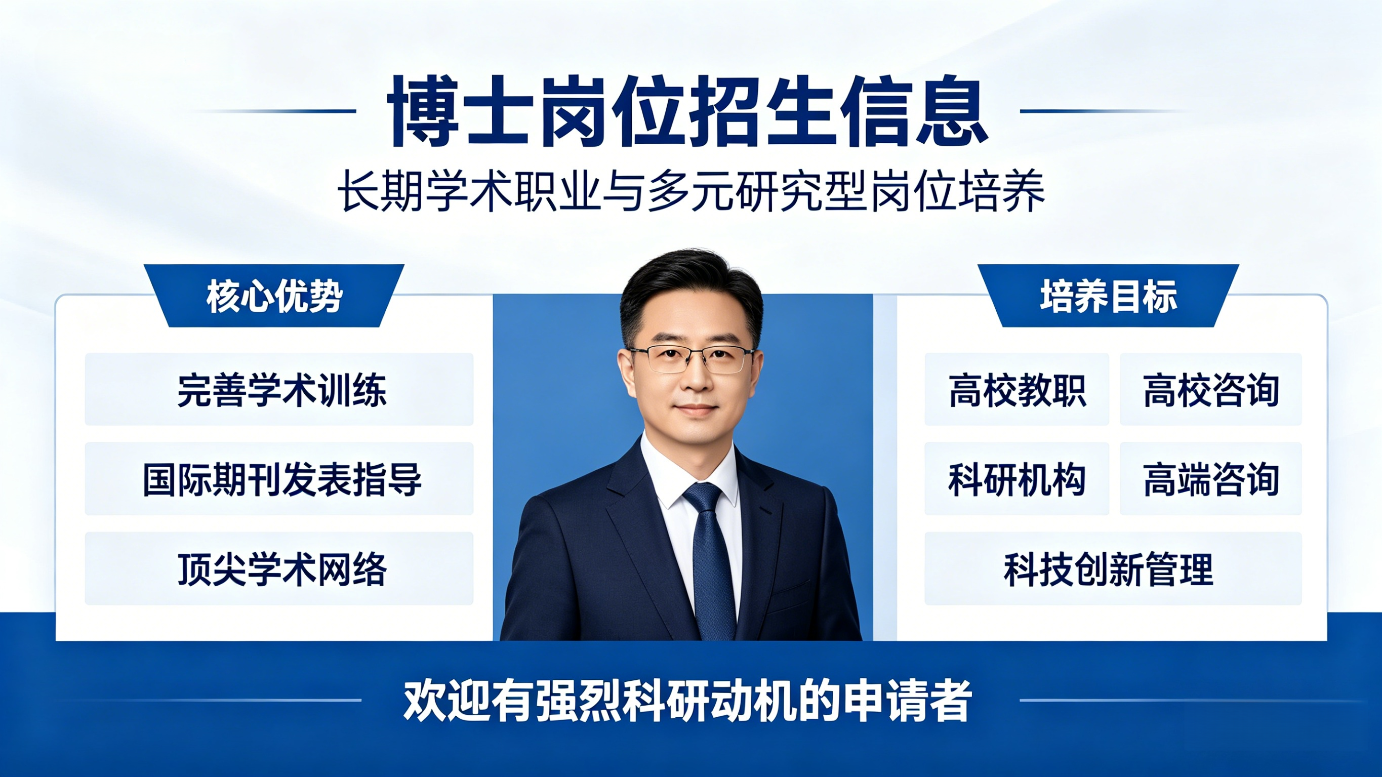 本博士岗位优先适合计划长期从事学术职业的申请者,为其提供完善的学术训练、国际期刊发表指导与顶尖学术网络。同时也欢迎拥有其他职业规划,但具备强烈科研动机、追求严谨研究并致力于在顶级学术期刊发表成果的申请者。项目培养目标不局限于高校教职,也为科研机构、高端咨询、科技创新管理等研究型岗位输送高素质人才,助力毕业生在学术与产业高端领域实现长期发展。