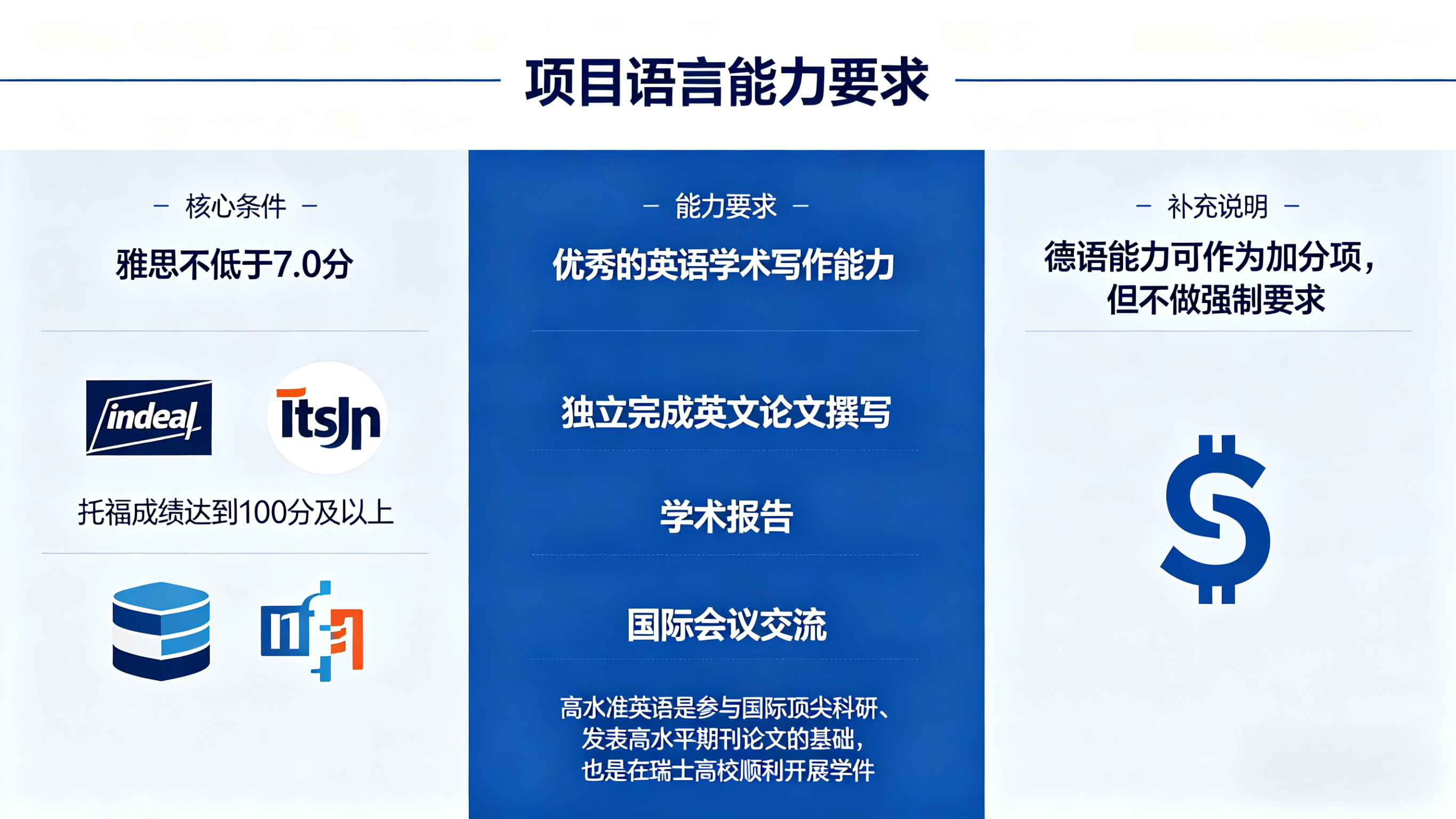 语言能力是本项目核心申请条件,要求申请者雅思不低于7.0分,托福成绩达到100分及以上。同时必须具备优秀的英语学术写作能力,能够独立完成英文论文撰写、学术报告、国际会议交流等工作。高水准英语是参与国际顶尖科研、发表高水平期刊论文的基础,也是在瑞士高校顺利开展学习、研究与合作交流的必备条件,德语能力可作为加分项,但不做强制要求。