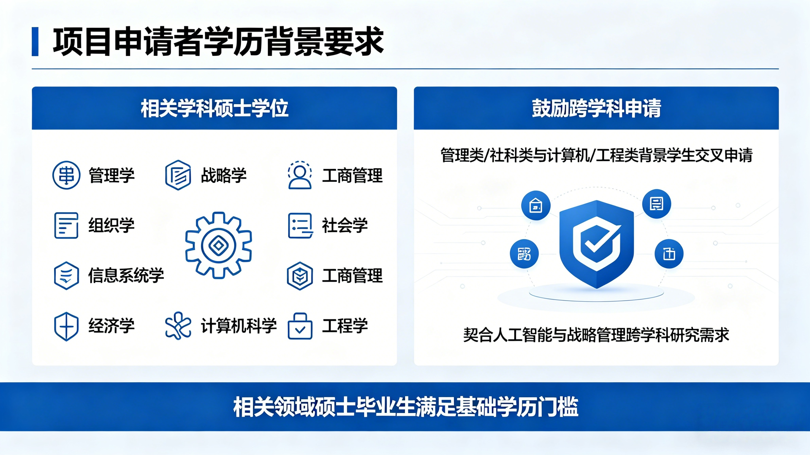 项目对申请者学历背景实行开放包容政策,要求具备相关学科硕士学位,涵盖管理学、战略学、组织学、信息系统学、社会学、工商管理、经济学、计算机科学、工程学等专业。鼓励管理类、社科类与计算机、工程类背景学生交叉申请,契合人工智能与战略管理跨学科研究需求。多元学科背景能够为研究带来不同视角,提升团队创新能力,符合条件的相关领域硕士毕业生均可满足基础学历门槛。