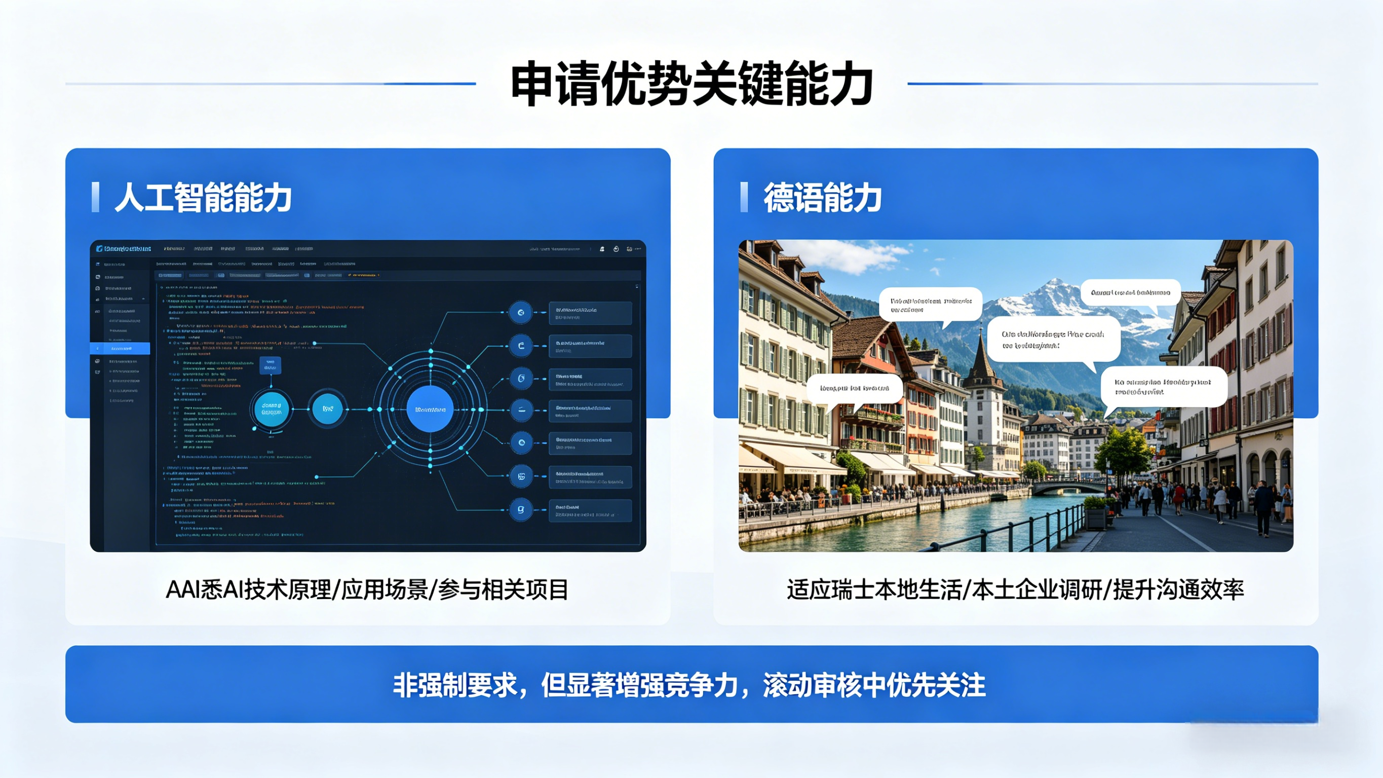 除基础要求外,具备人工智能相关知识或实践经验,将成为重要申请优势。熟悉AI技术原理、应用场景或参与过相关项目,能更快融入研究主题,理解交叉领域核心问题。掌握德语可更好适应瑞士本地生活与本土企业调研,提升沟通效率。这两项能力虽非强制要求,但能显著增强申请竞争力,帮助申请者在滚动审核中脱颖而出,获得导师与评审团队的优先关注。