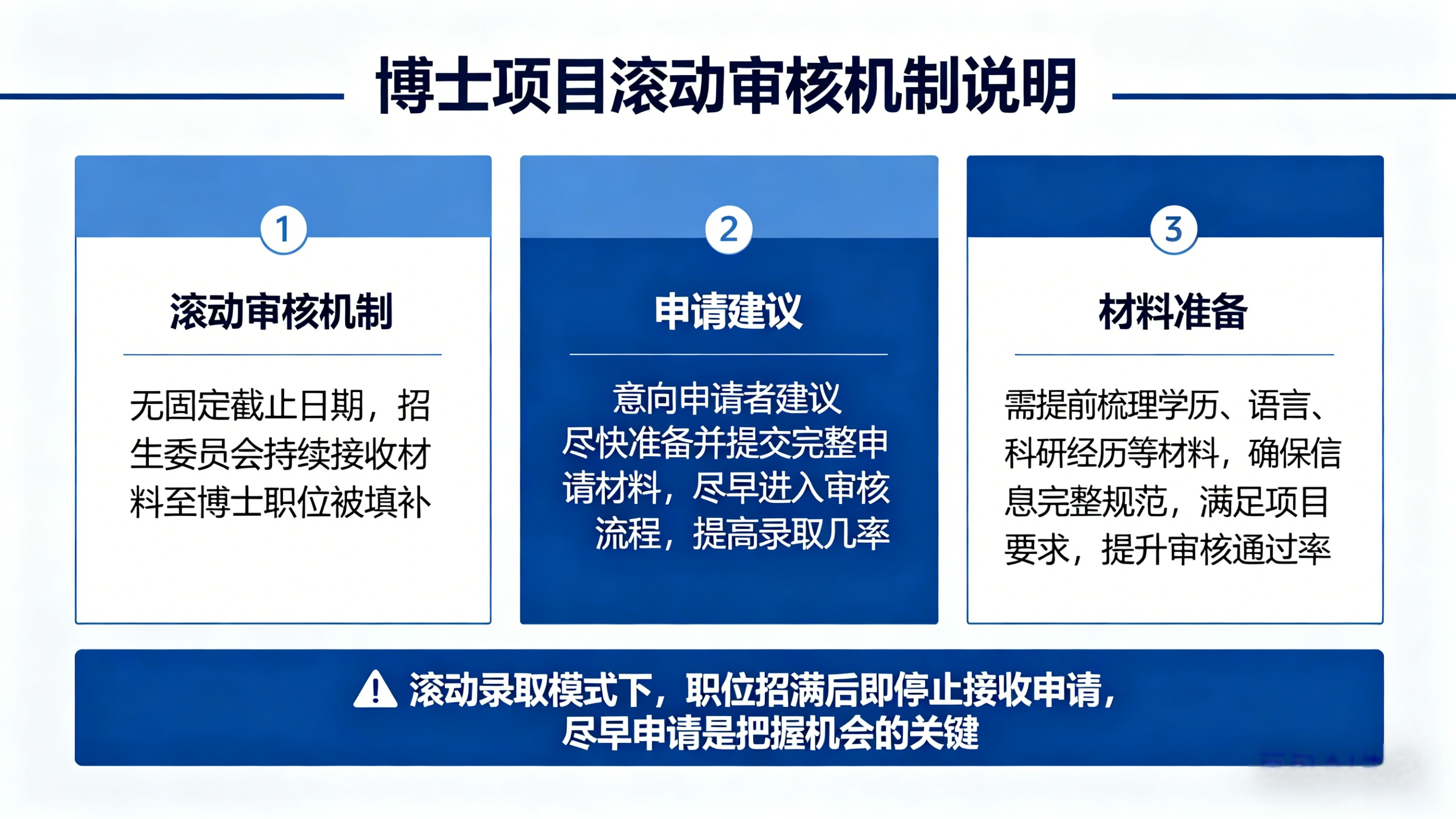 本项目采用滚动审核机制,无固定截止日期,招生委员会持续接收材料,直至博士职位被填补。意向申请者建议尽快准备并提交完整申请材料,尽早进入审核流程,提高录取几率。滚动录取模式下,职位招满后即停止接收申请,因此尽早申请是把握机会的关键。申请者需提前梳理学历、语言、科研经历等材料,确保信息完整规范,满足项目各项要求,提升审核通过率。