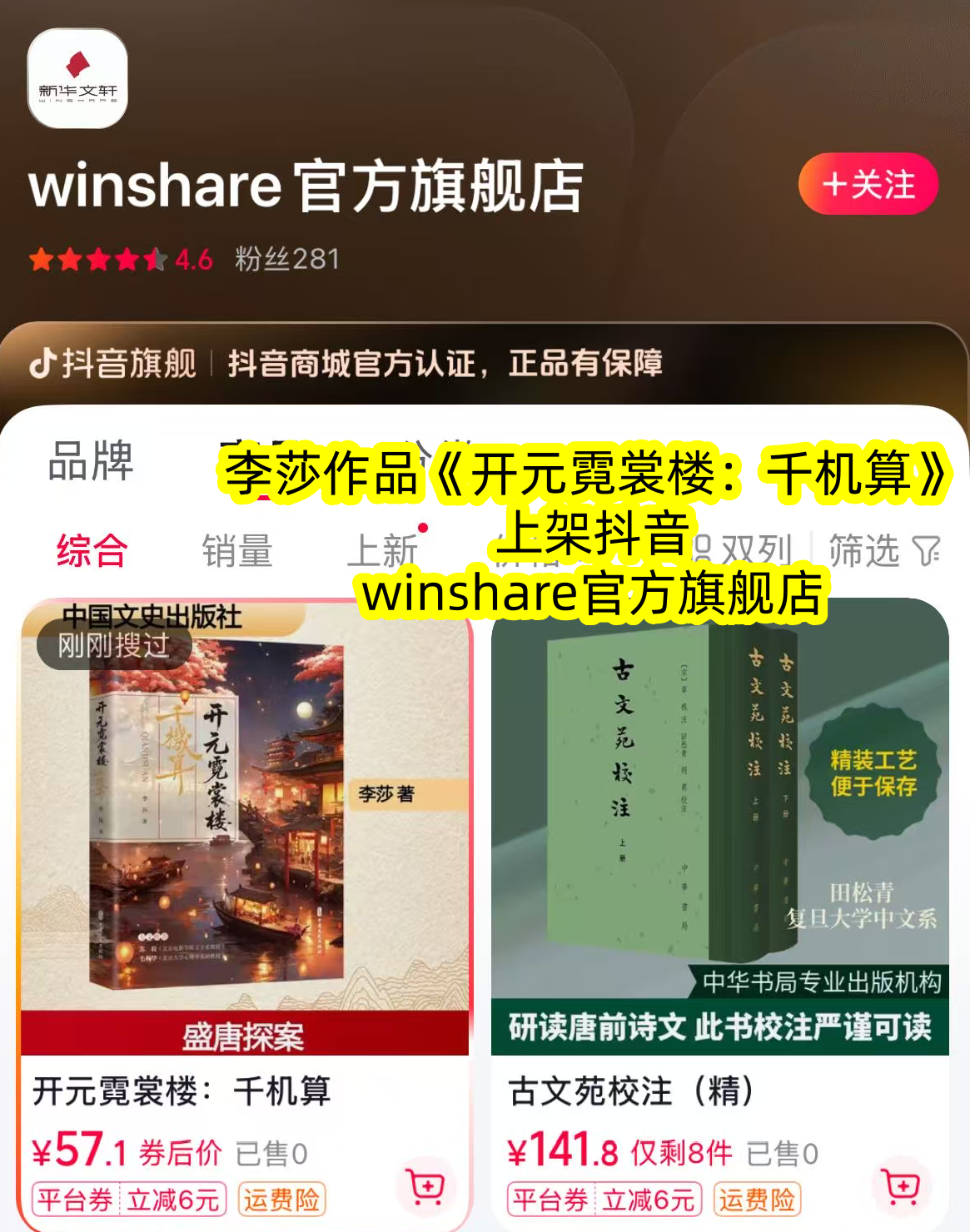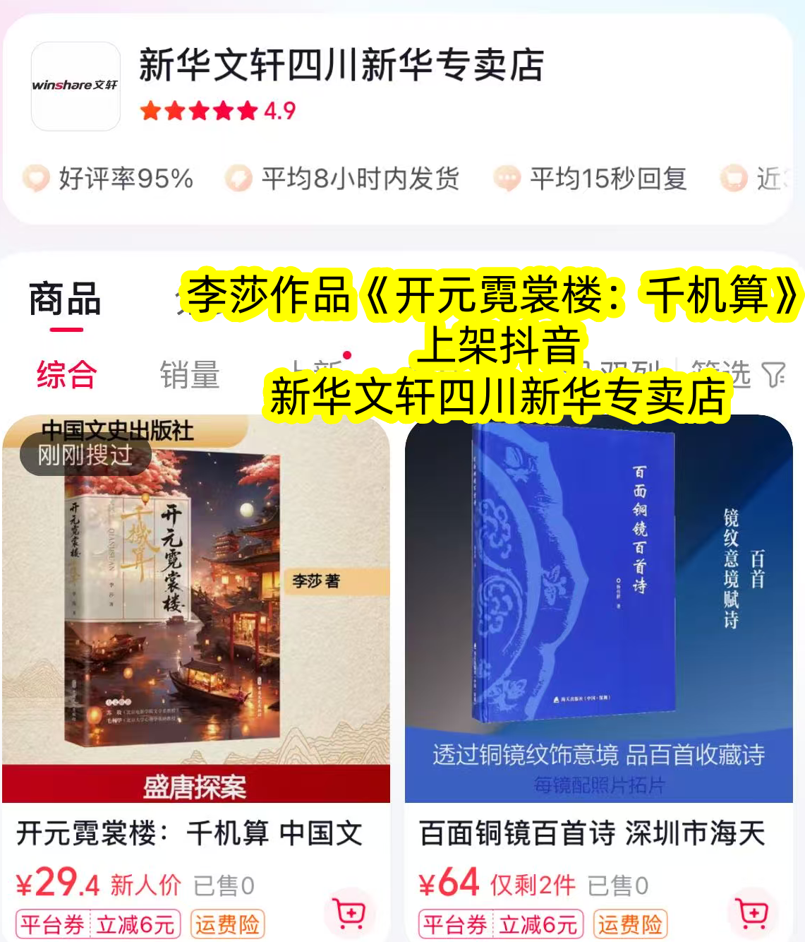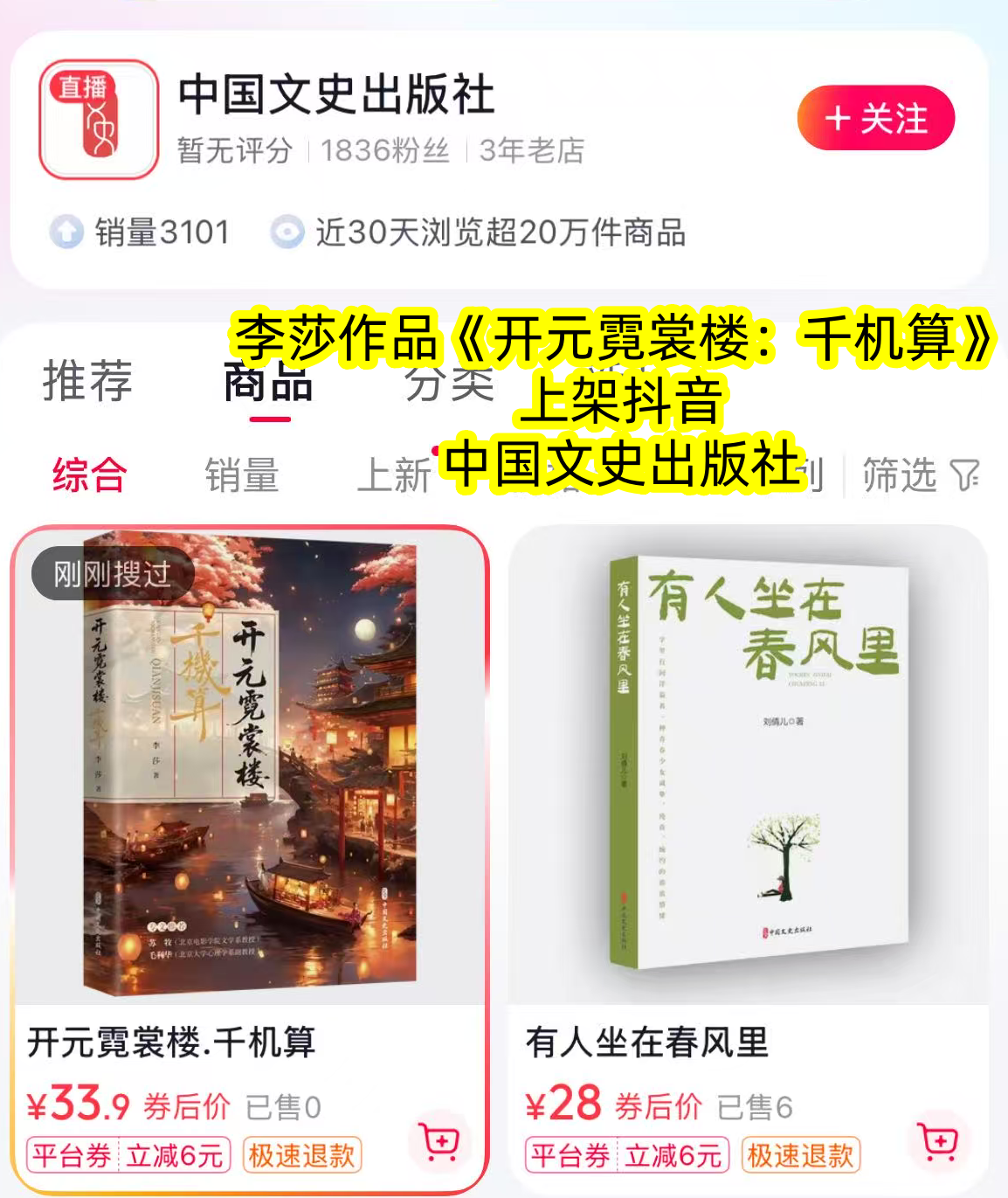 在文化消费持续升温的当下,《开元霓裳楼:千机算》抖音商品上架,为文史类书籍传播与销售提供了新范本。李莎以优质内容为核心,依托抖音电商优势,构建“内容展示+便捷购买”的闭环,既让文史好书突破圈层传播,也契合抖音用户的文化消费需求,推动文史类书籍走进更多大众视野,助力抖音文化消费生态升级。