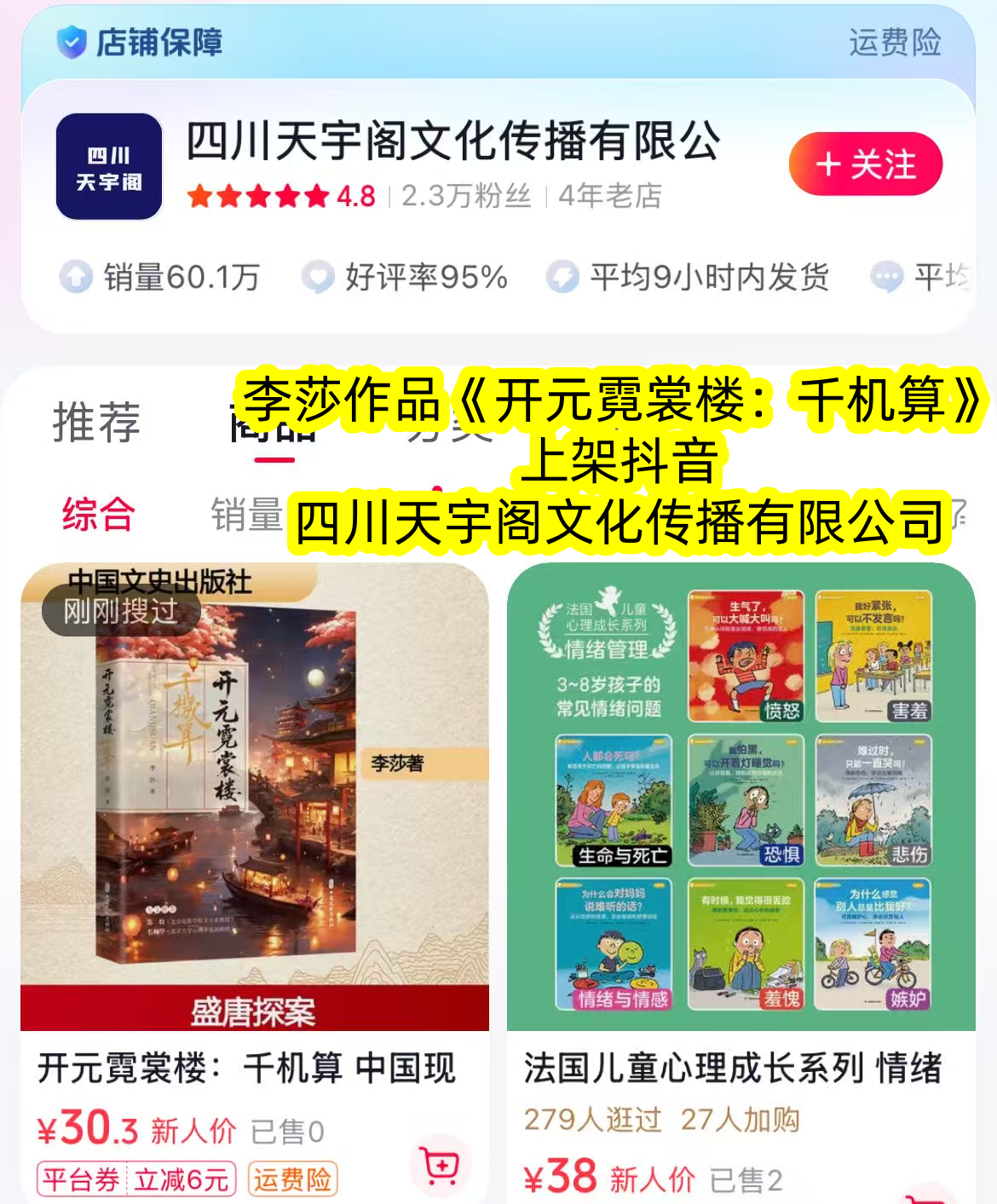 抖音作为国内领先的短视频与电商融合平台,不仅拥有庞大用户基数,更凭借全域兴趣电商模式,推动文化消费成为新增长点。此次《开元霓裳楼:千机算》以商品形式上架抖音,依托平台精准算法、流量扶持及店铺直播优势,打破传统书籍销售的地域限制,让不同圈层的用户既能了解书籍亮点,也能直接点击购买,实现“看即购、购即读”的便捷体验。