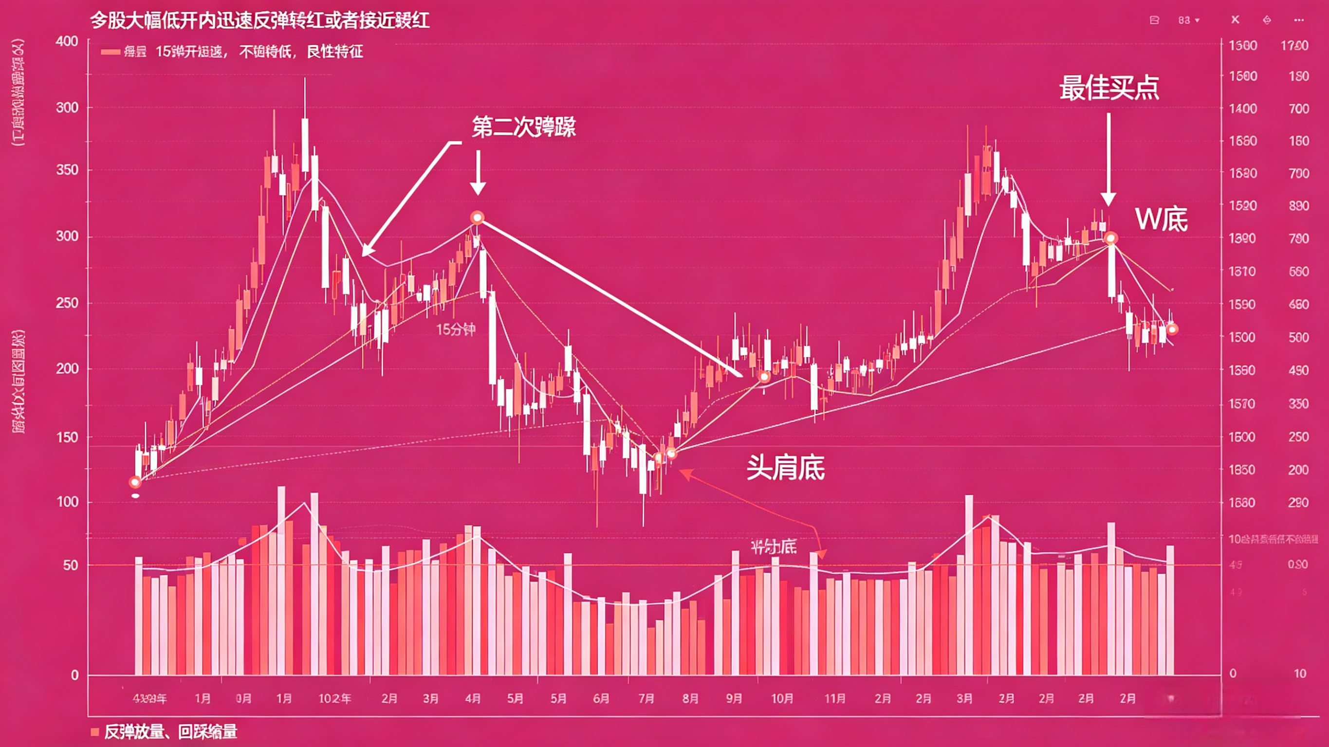 个股大幅低开,但开盘后15分钟内迅速反弹翻红或接近翻红,随后再度回踩开盘低价区域却不创新低,这就形成了“W底”或“头肩底”结构。何青平提醒,此时成交量必须呈现“反弹放量、回踩缩量”的良性特征。最佳买点在第二次回踩确认后的拐头向上瞬间。如果反弹无量或回踩放量,一律放弃,这是他用真金白银换来的教训。