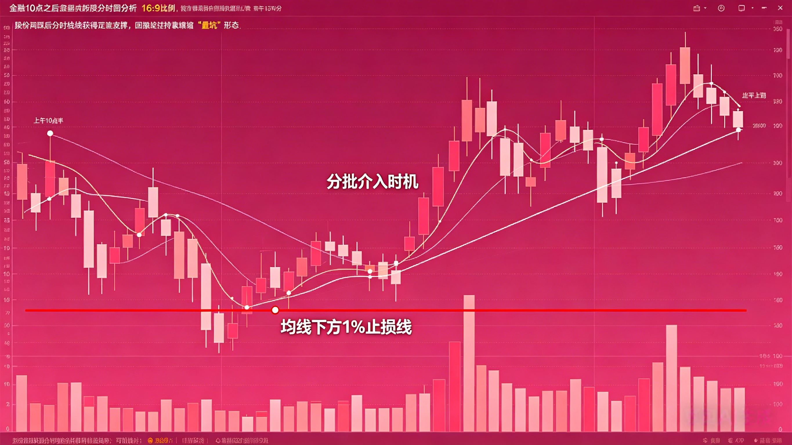 上午10点半之后,股价经历一轮拉升进入横盘或缓跌,关键看回撤过程中成交量是否持续萎缩,形成“量坑”形态。何青平认为,当股价回踩分时均线并获得明显支撑,且均线方向由下行转为走平甚至上翘,就可以分批介入了。缩量回撤代表抛压衰竭,主力没有出逃,这与普通下跌有本质区别,止损线设在均线下方1%。