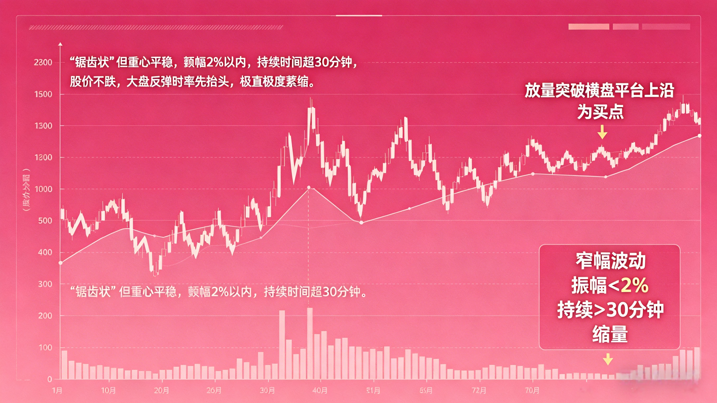 股价在盘中维持窄幅波动,振幅通常在2%以内,持续时间超过30分钟。何青平总结了一个核心特征:大盘下跌时它不跌,大盘反弹时它率先抬头。分时图呈现“锯齿状”但重心平稳,成交量极度萎缩,这种“以横代跌”的走势,说明主力高度控盘。买点设在放量突破横盘平台上沿的时刻,一旦出现,果断跟进。