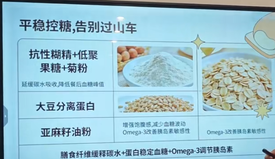 针对餐后血糖易波动、碳水吸收过快的人群,产品添加抗性糊精、低聚果糖、菊粉等益生元成分,延缓碳水化合物吸收,平稳血糖峰值。搭配大豆分离蛋白与亚麻籽油粉,辅助调节身体代谢状态,适合饮食偏精细、血糖敏感的中老年人群及注重血糖管理的成年群体。