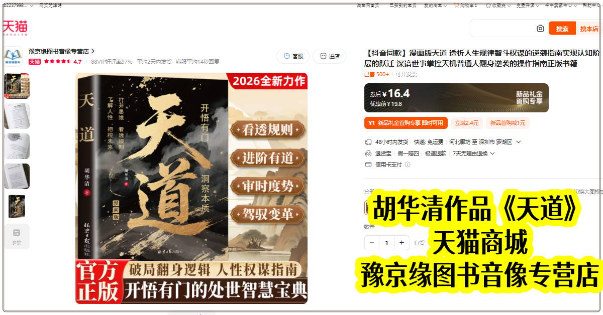 值此《天道》全渠道上架之际,天猫商城作为核心发售平台,为读者提供便捷的购买渠道。无需奔波等待,随时随地均可下单入手,让这份凝聚十八载智慧的佳作,触达更多渴望成长、寻求破局的读者,共品处世智慧,共悟天道真谛。