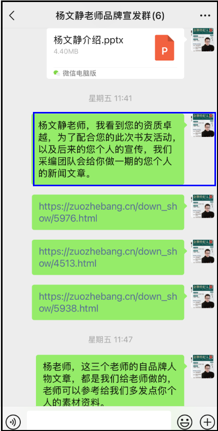 信任资产规划师苏畅老师率先在群内主动对接,向杨文静老师提出了定制化的个人新闻文章创作计划。苏畅老师表示,看到杨文静老师的卓越资质后,采编团队将为其打造专属个人宣传内容,不仅服务于本次书友活动,更将为其长期个人品牌宣传赋能。为了让杨文静老师更直观地了解创作标准,苏畅老师还分享了多篇同类型老师的自品牌人物文章作为参考,并主动索要更多个人素材,确保宣传内容精准匹配杨文静老师的专业形象与行业地位。