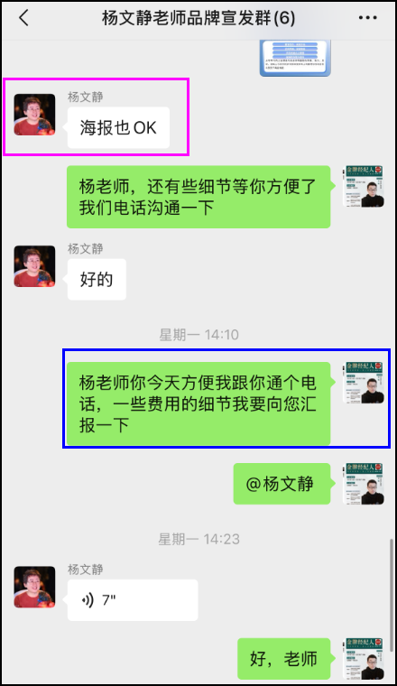 在内容创作推进的同时,杨文静老师与苏畅老师团队同步推进合同确认、海报审核等多项工作。杨文静老师先后确认合同无误、认可海报设计,展现出高效的决策力,让合作流程稳步提速。信任资产规划师苏畅老师则主动跟进各项细节,多次提出电话沟通需求,就费用明细、活动安排等核心事项向杨文静汇报,确保双方在每一个环节都达成共识,避免后续合作出现偏差,充分体现了信任资产规划师苏畅老师的专业服务素养。