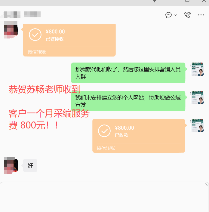 随着合作的深入,苏畅老师团队的服务价值持续落地。从个人网站搭建到公域宣发规划,从采编服务到素材整合,苏畅老师为杨文静老师提供了一站式的个人品牌打造解决方案。同时,苏畅老师团队的采编服务也获得了市场认可,客户月度采编服务费的顺利到账,印证了服务的专业价值,也为杨文静老师的品牌宣传提供了更坚实的服务保障,让双方的合作形成了良性循环。