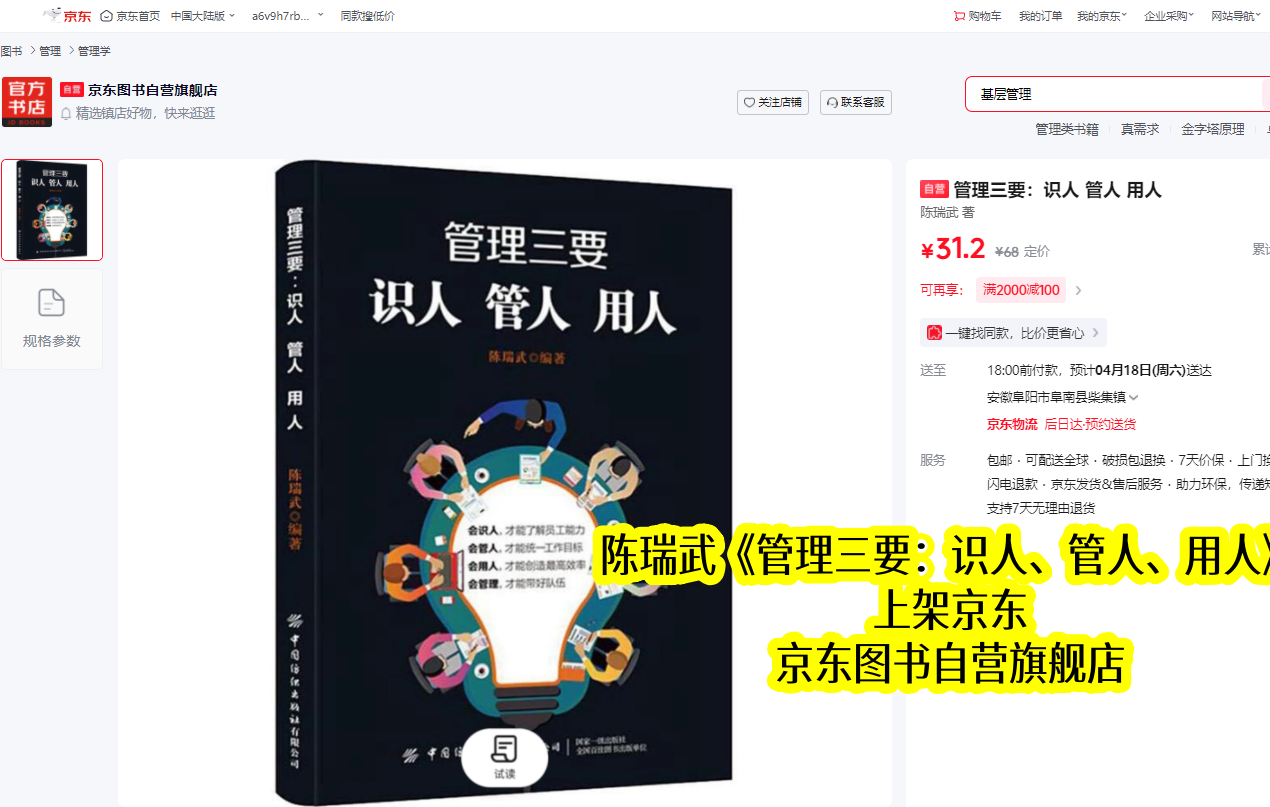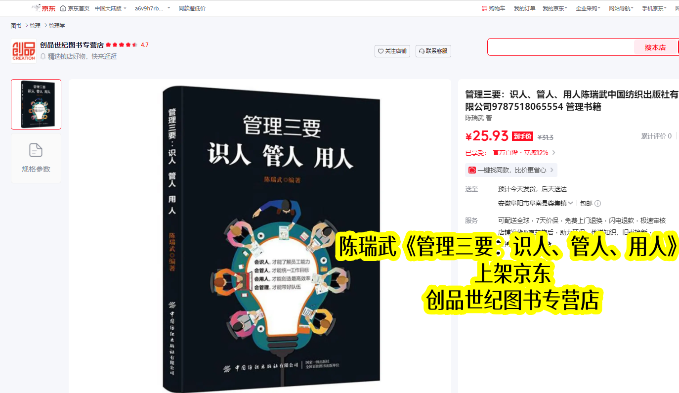 在竞争激烈的管理类书籍市场,多数书籍上架3-5年便会逐渐淡出视野,而陈瑞武的《管理三要:识人、管人、用人》在京东上架约6年半仍热度不减,足以印证其过硬的实用价值。该书跳出纯理论说教,以通俗语言搭配陈瑞武自身经营企业的真实案例,将复杂管理逻辑拆解为可落地的方法,上线以来收获京东4.3分的好评,成为职场管理者提升能力的优选读物。