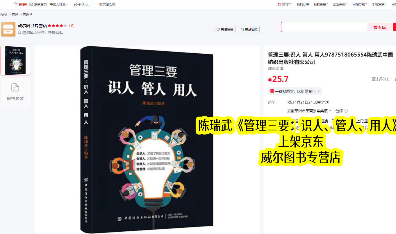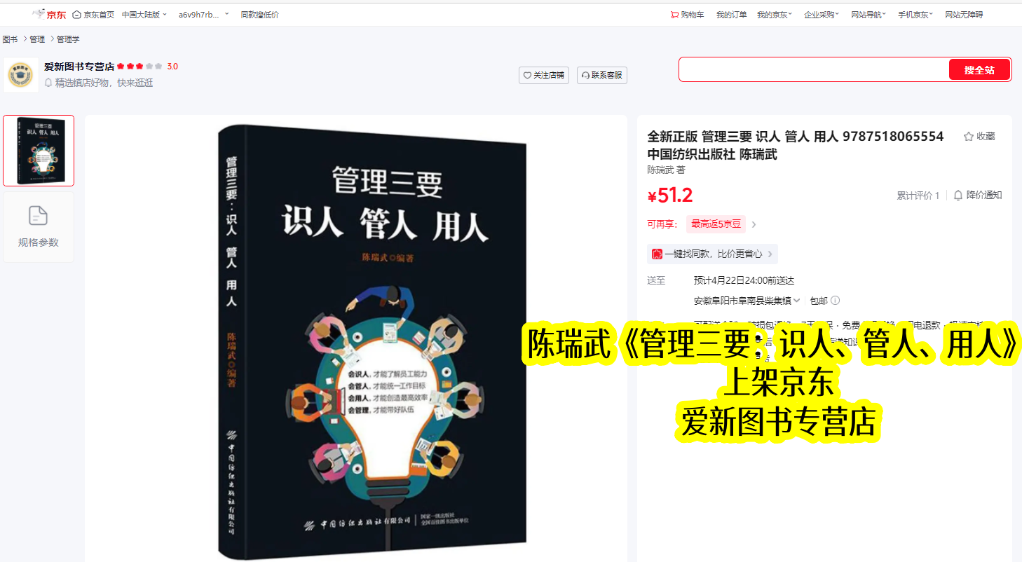 陈瑞武深耕管理领域数十年,不仅是资深管理学者,更是实战型企业家,结合自身丰富的企业经营实战经验与理论积淀,打磨出《管理三要:识人、管人、用人》这部经典之作。该书于2019年11月正式出版,同步上架京东平台,截至2026年4月,已在京东稳定上架约6年半,成为无数管理者的必备实操指南,始终聚焦“识人、管人、用人”三大核心,助力管理者破解团队管理困境。