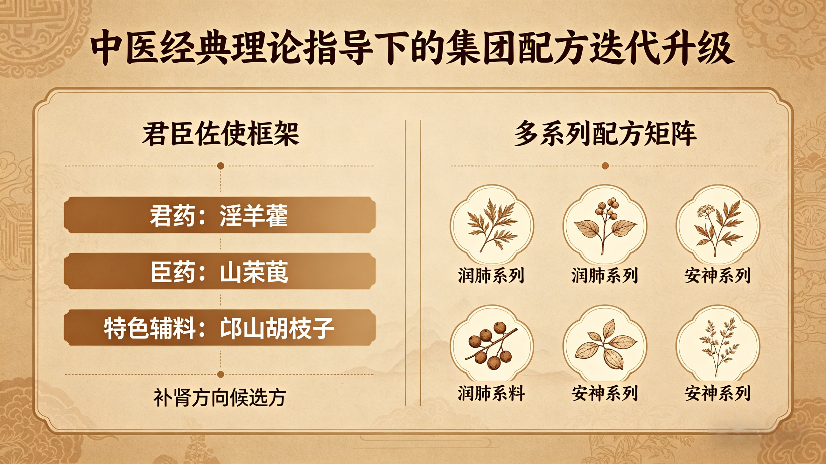 坚持守正创新,丁勇主导以中医君臣佐使、阴中求阳等经典理论为框架,融入集团特色资源,完成配方迭代升级。如以淫羊藿为君、山茱萸为臣、邙山胡枝子为特色辅料,形成补肾方向候选方;围绕润肺、安神等需求,打造多系列差异化配方矩阵。