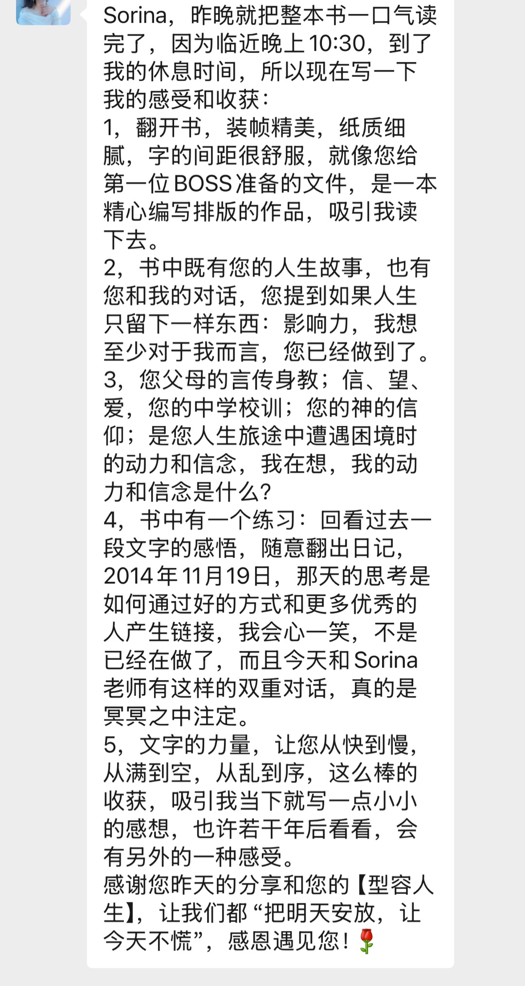 感谢你的分享,也感谢你写出《型容人生》。你不是在教我怎么成功,而是在教我怎么安放自己。在我未来的路上,无论遇到什么样的风雨,我都会记得:有一个人,曾经用她的文字,让我看见了自己。感恩遇见你,Sorina。愿你的光,继续照亮更多人。