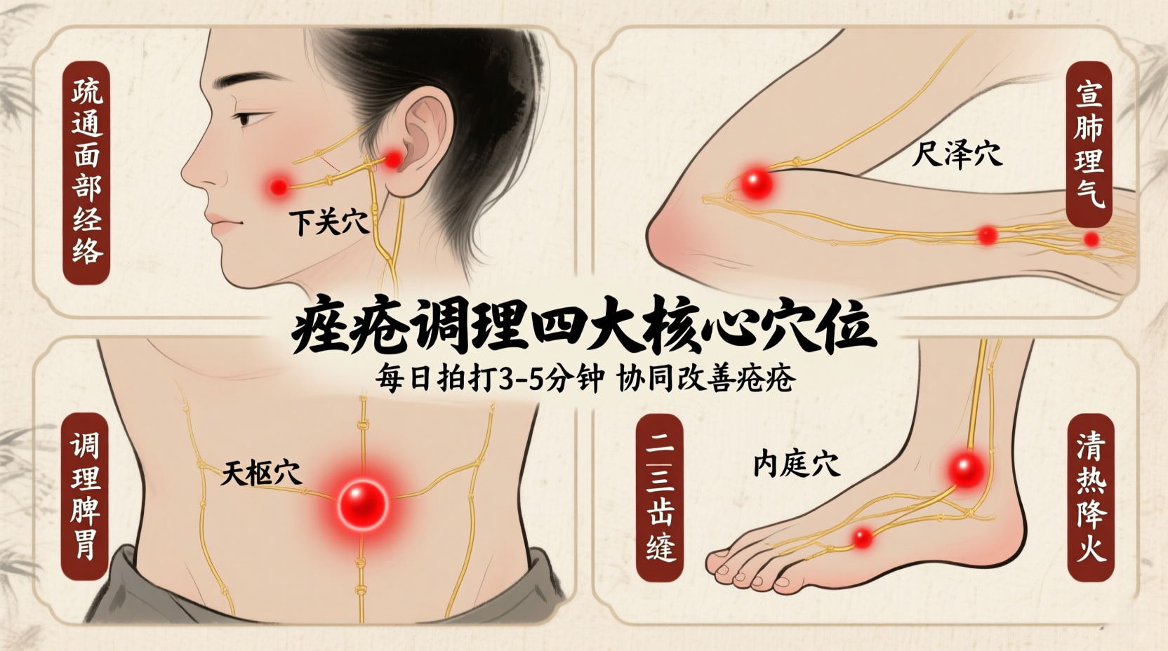 结合宣肺理气的治法,精选出4个核心穴位,专门用于痤疮调理,分别是下关、尺泽、天枢、内庭。这四个穴位各司其职、协同发力,下关疏通面部经络、缓解局部炎症,尺泽宣肺理气、排出湿热,天枢调理脾胃、改善消化,内庭清热降火、减少油脂,搭配拍打可最大化发挥康养功效。