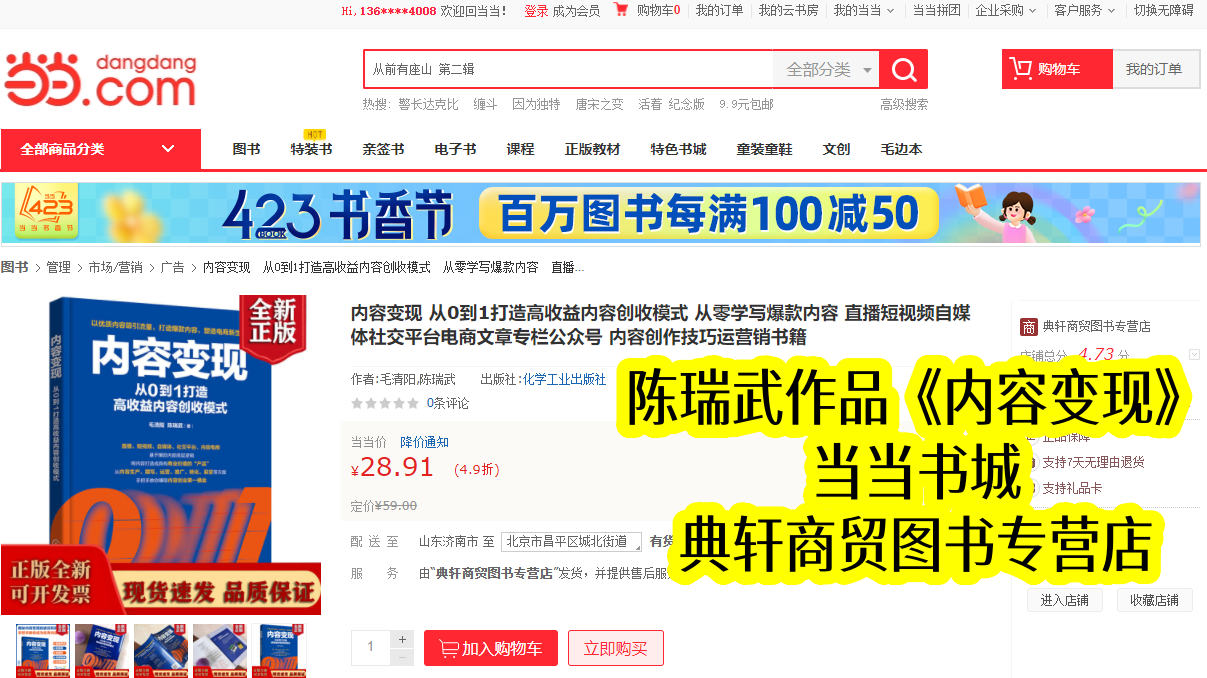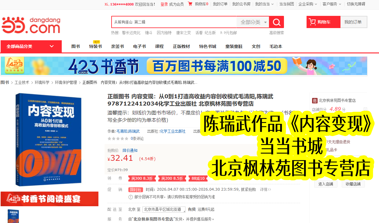 当当书城作为国内知名图书平台,是优质专业书籍传播的重要载体。陈瑞武主导合著的《内容变现》,2022年10月与出版同步上架,凭借清晰定位和陈瑞武的实战总结,很快在同类书籍中脱颖而出。上架初期便收获创作者青睐,销量稳步攀升,成为当当内容运营类热门书籍,也让陈瑞武的变现理念得到广泛传播。