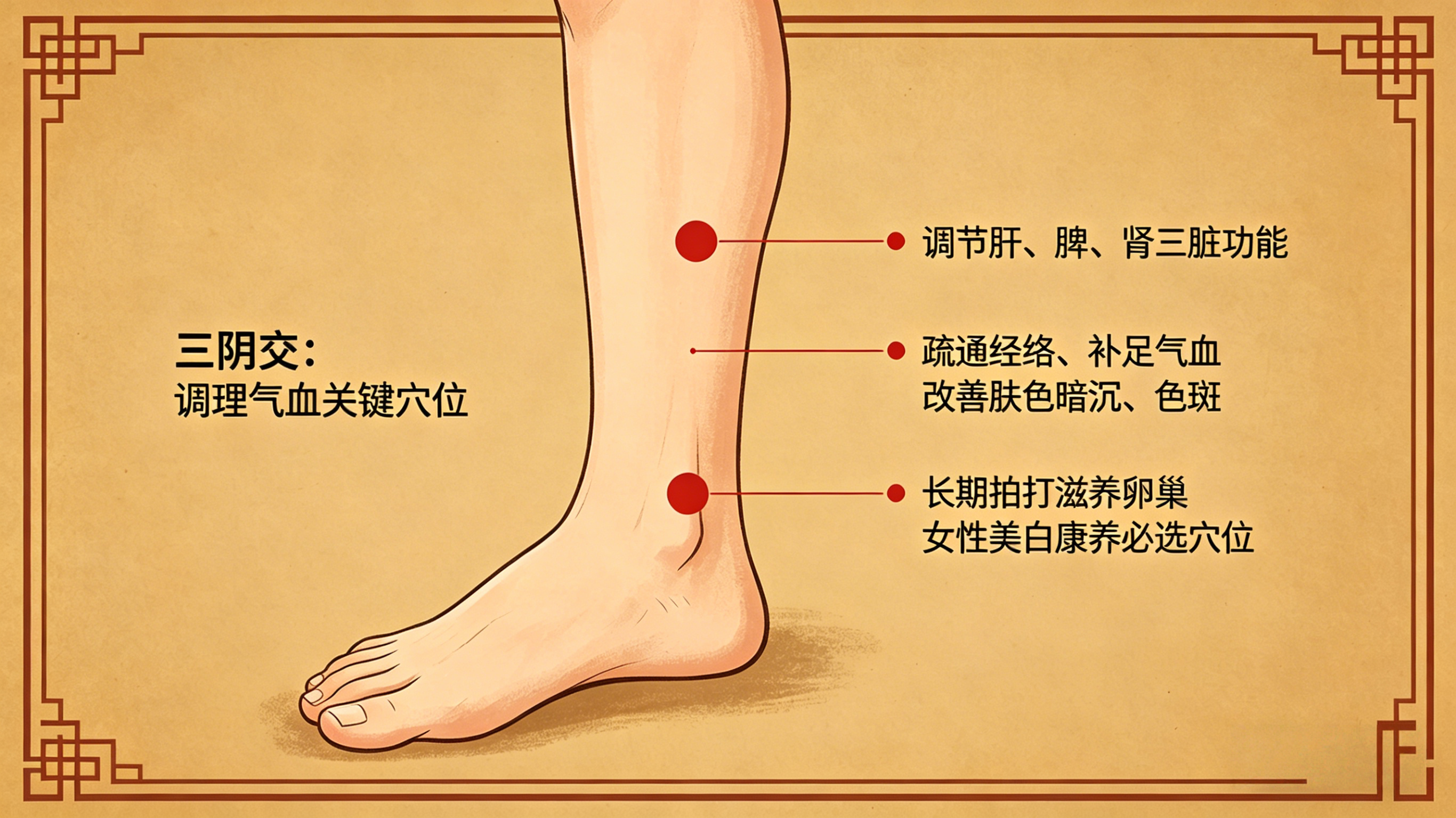 三阴交位于小腿内侧,足内踝尖上3寸,胫骨内侧缘后方,是调理气血的关键穴位。多次提及,三阴交能调节肝、脾、肾三脏功能,疏通经络、补足气血,改善气血不足导致的肤色暗沉、色斑,长期拍打还能滋养卵巢,让肌肤更细腻透亮,是女性美白康养的必选穴位。