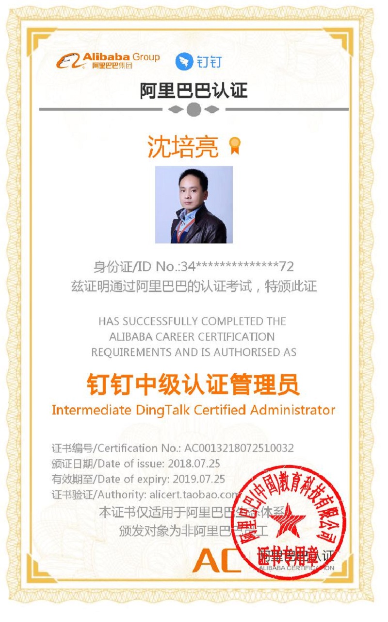 在出书大师网运营总监沈培亮积极努力之下,沟通效率、协同办公的畅通都有了大幅的提升,为客户提供更加满意的服务体验,并获阿里巴巴集团的认可,颁发钉钉管理中级证书。