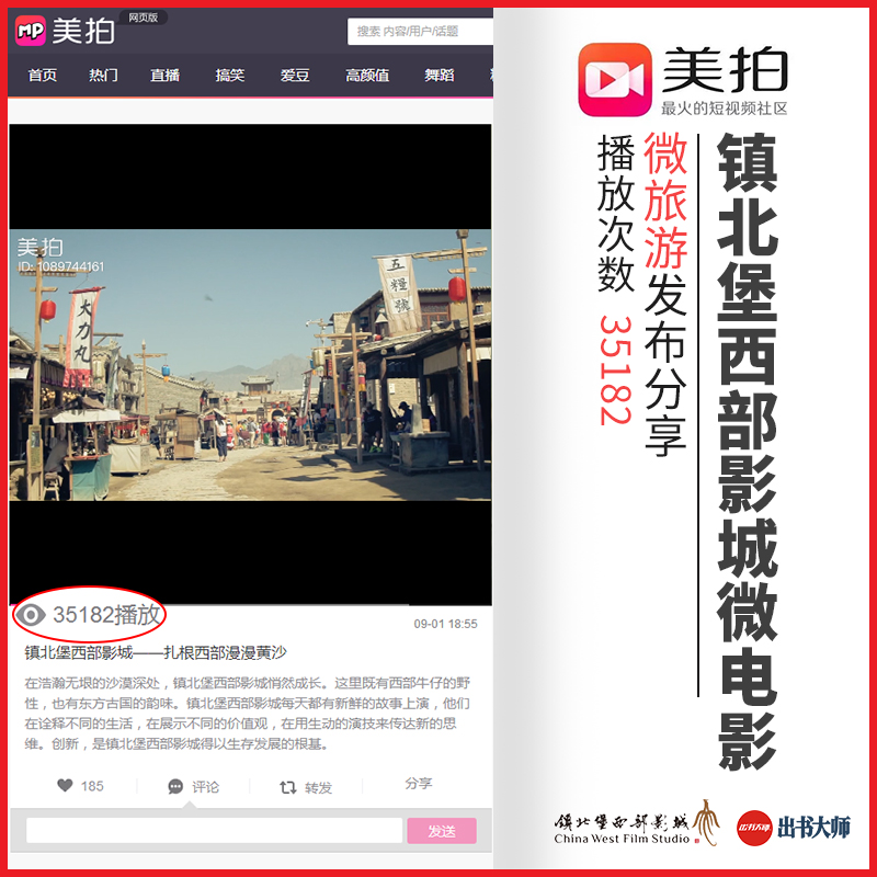 近日来更是听闻,出书大师网VIP合作伙伴、华夏西部影城有限公司董事长米高猫老师亲力亲为、自编自导了一部微电影作品——镇北堡西部影视城微电影。出书大师网媒公司合作伙伴美拍达人“微旅游”分享了这部短片,短时间内就获得35182次的播放量,收到了大众的一致认可与好评。