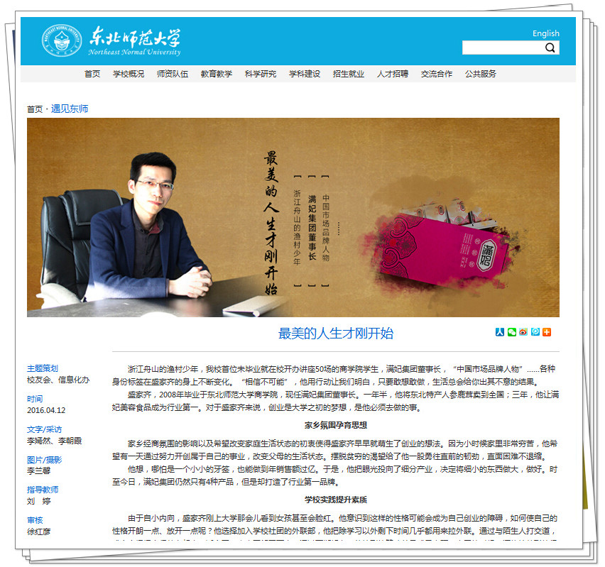 满妃集团董事长,85后年轻企业家,一手打造中国最大微商企业--满妃集团,作为东北师范大学校友,东北师范大学“校友智库生涯规划导师”,在东北师范大学建校70周年之际,荣登东北师范大学官网首页。这是一份荣耀,更是一份责任!承载了母校对他的期望和认可。