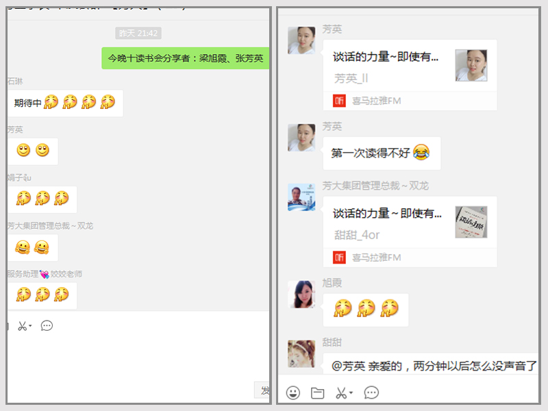 这本书对张芳英影响很大,给了她很大的帮助。她说,她自己其实不是一个很擅长交流沟通的人,在别人眼里,她就是个安静的摆设,想参与别人的谈话中,但她也不知道从何说起,每次都是看着别人言谈愉悦,自己只好配合的笑笑。这本书对她最大的帮助,就是她也可以自如的,从容不迫的与别人交流。