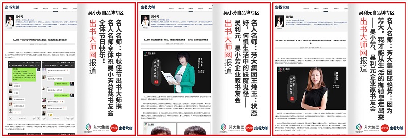 针对两位老师的自品牌,出书大师以书籍推广为核心宣传点,用书成就自品牌始终是出书大师成立的初衷。在这个过程中,出书大师旗下出后服务部收集并整理两位老师的书友会相关文案资料,通过文字、图片的形式加以渲染和表达,然后再通过各大权威媒体进行广泛报道,通过网络,将两位老师的自品牌传递,公众也可以获知相关媒体信息和资源。