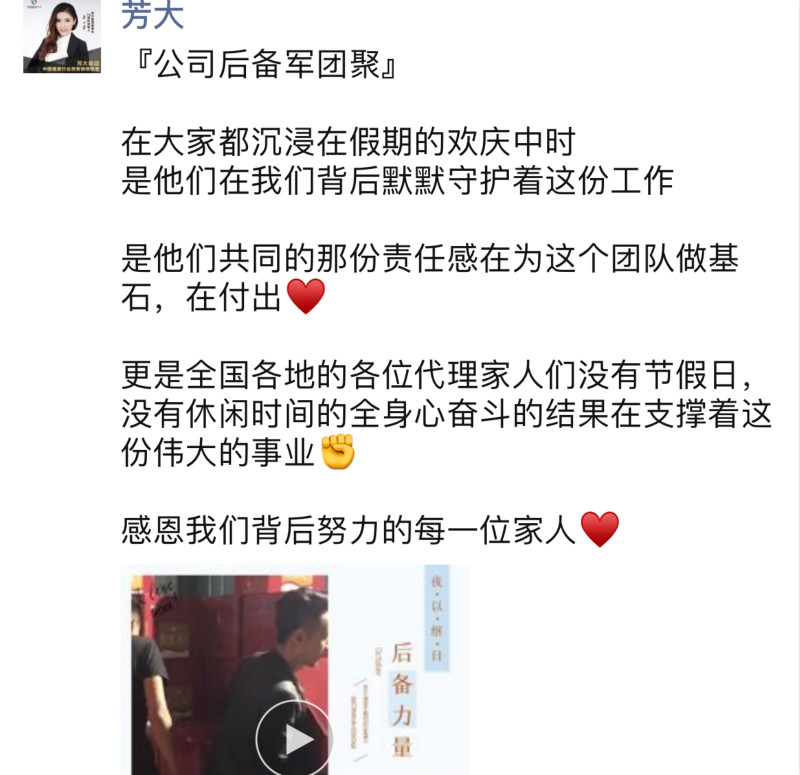在国庆节期间,当大多数人都沉浸在假期的欢乐气氛中,带着自己的朋友家人游山玩水时,芳大集团董事长吴小芳在朋友圈中分享了一段视频。视频中的芳大人,并没有选择在假期休息,而是仍然坚持在微商事业的第一线,为了自己钟爱的事业而奋斗,这一切都被吴小芳董事长看在眼里,不由得发出感慨:“正是有了这么多没有休闲时间,全身心的投入到工作中的代理家人们,才有了今天的芳大,才有了这份伟大的事业,感恩我们背后努力的每一位家人”。