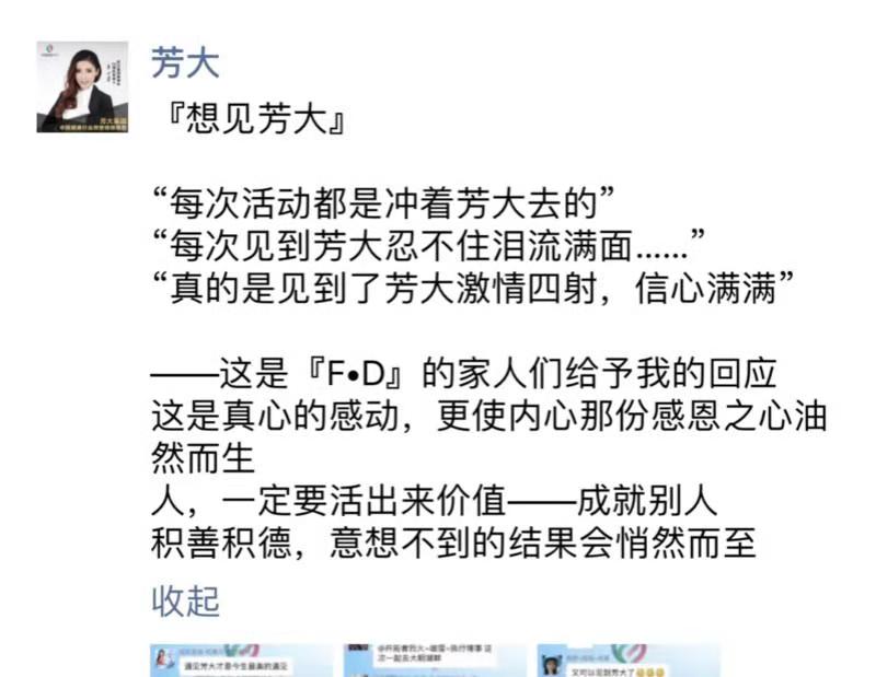 每一次活动,她都激情澎湃,自信满满。每一次指导,她都用尽全力,倾囊相授。虽然芳大集团的董事长,却仍亲力亲为,方方面面,指导团队如何做好销售,如何进行沟通,小到一个行为表现,细致到言语沟通。