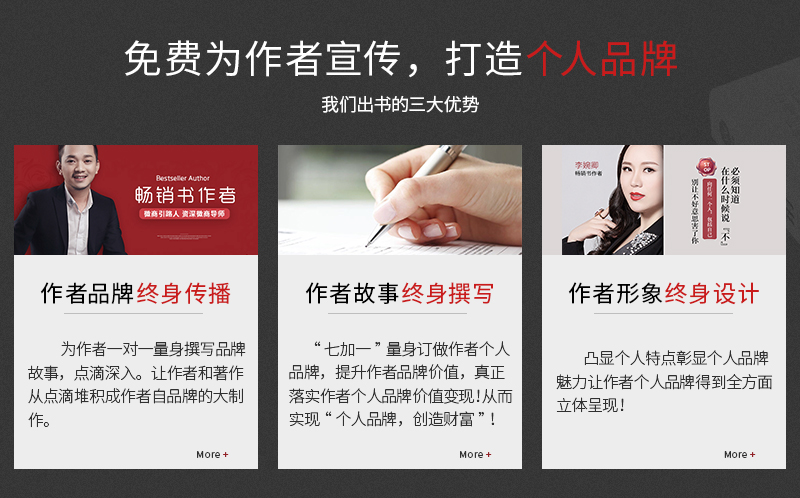 建立胜利者的形象,首先要有胜利者的形态,在企业人过硬的产品知识、业务知识、工作方法和技能技巧之上,出书大师网深度分析市场的需求,以市场需求出发,放大企业人具有感染力的一面,依靠企业人深富魅力的个人形象,吸引员工的行为不断地向前发展向更高靠拢、吸引读者的心理和精神认同,促进流量的转化,达到营销的终极目的。