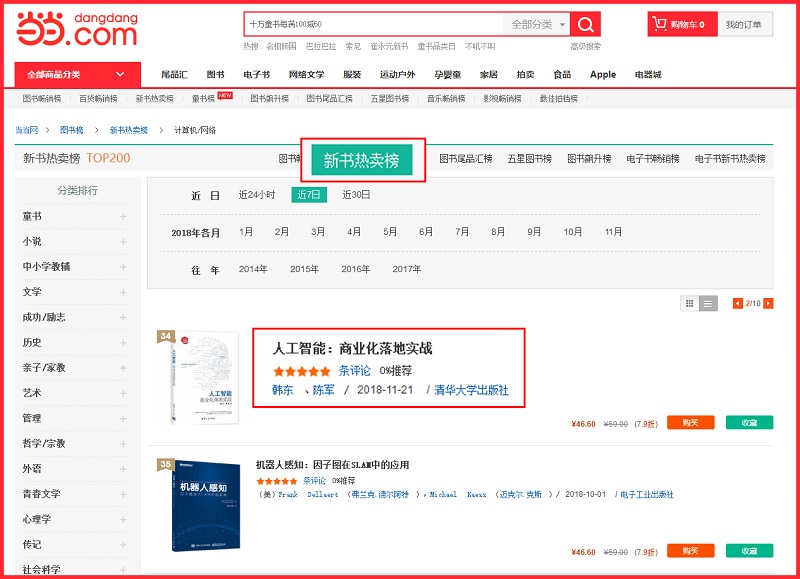 当当网的新书热销榜是综合了书籍内容的前瞻性,作品的受欢迎程度以及销售的火热情况等多方面来进行衡量,精心挑选最优质的作品推荐给读者。一般情况下,能够登上新书热销榜的都是精品书籍,很多读者都会参考新书热销榜来购买心仪的作品。陈顺军老师的《人工智能:商业化落地实战》此次登上新书热销榜,必将吸引更多人的目光,为将来的持续热销奠定基础。
