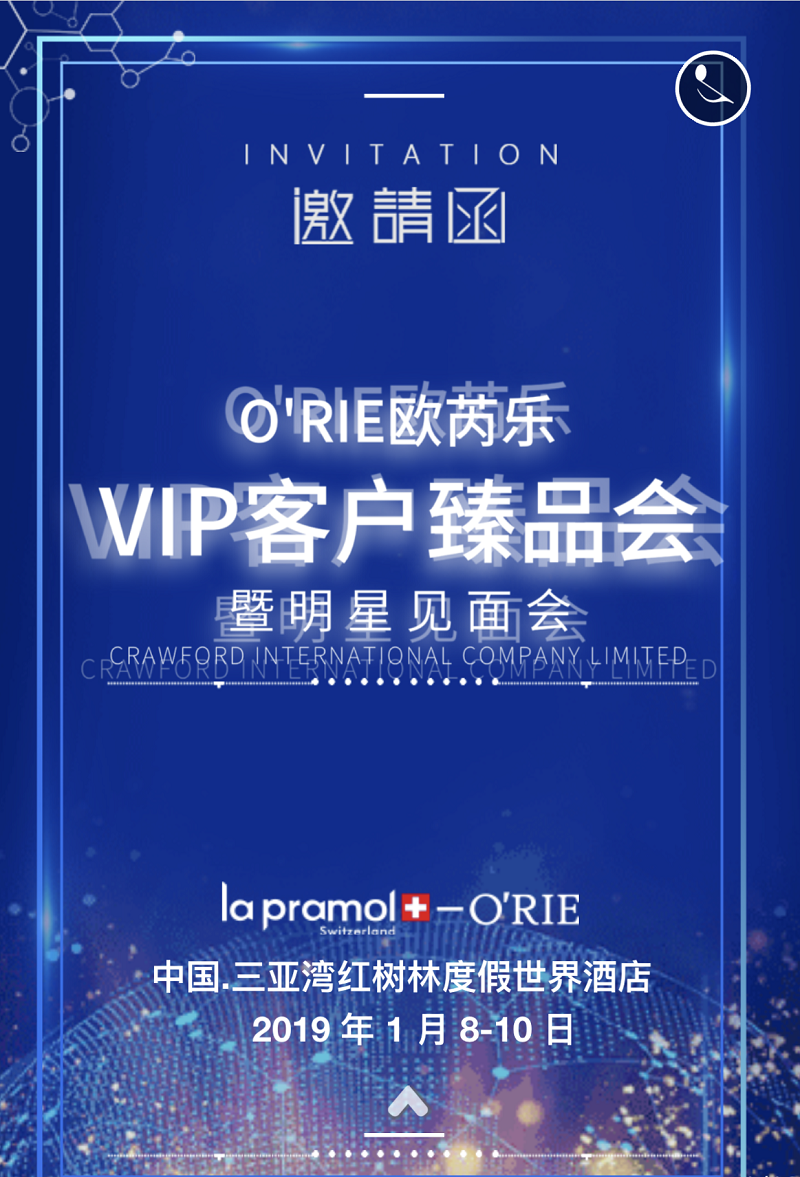 2019年1月8日到10日,卡连弗集团将在中国三亚湾红树林度假世界国际会议中心举办“O’RIE 殴芮乐VIP客户臻品会暨明星见面会”,将邀请e商新零售全球各大代理、各大知名媒体以及诸多合作伙伴共襄盛举、展望未来。