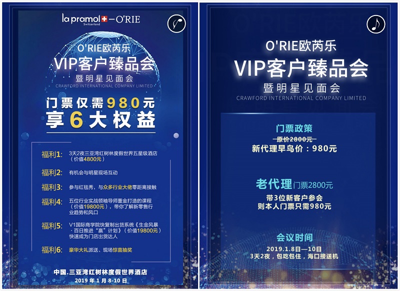 “O’RIE 殴芮乐VIP客户臻品会暨明星见面会”将会在中国三亚湾红树林度假世界酒店举办。红树林度假世界酒店位于享有“椰梦长廊”美誉的海南三亚湾,是一家巨无霸式五星度假酒店,具有71家主题餐厅,与会人员将奢华享受价值4800元的三天两夜豪华假期。