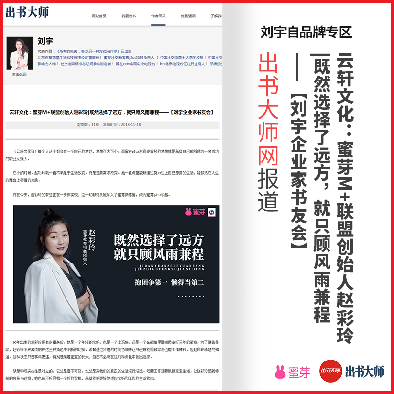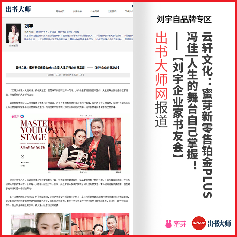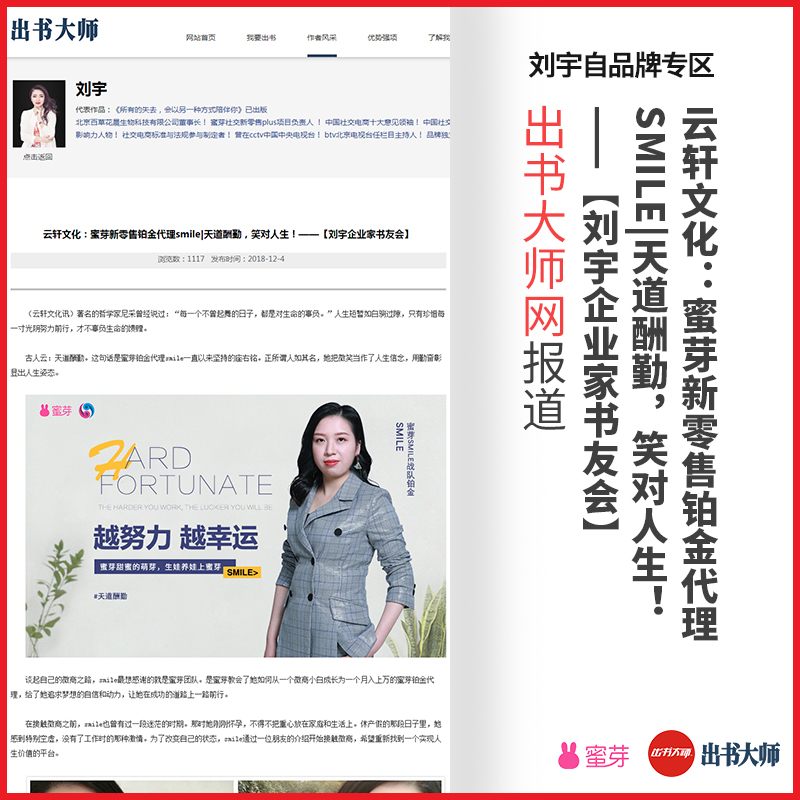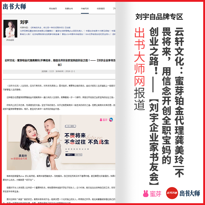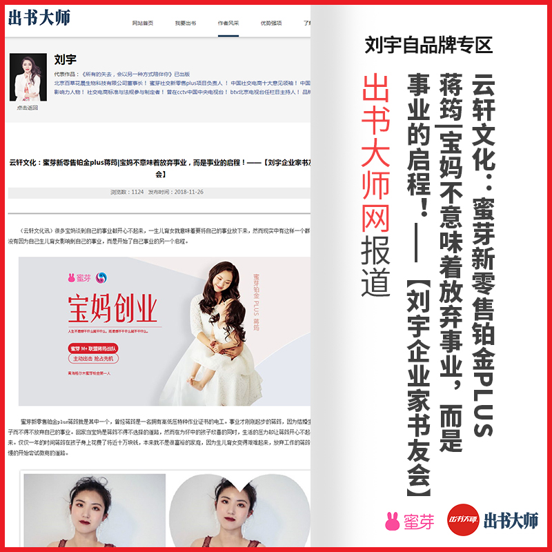祝愿刘宇老师的蜜芽团队不断壮大,出书大师网承诺为刘宇老师品牌形象的传播贡献更多力量!
