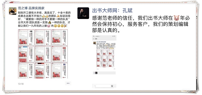 谈及出书大师网策划编辑部的业务能力,范之博老师的赞美之词,溢于言表。他表示很幸运在自己刚刚开工,就收到了来自出书大师网的“自品牌推广大礼”,以此开启工作历程新篇章。