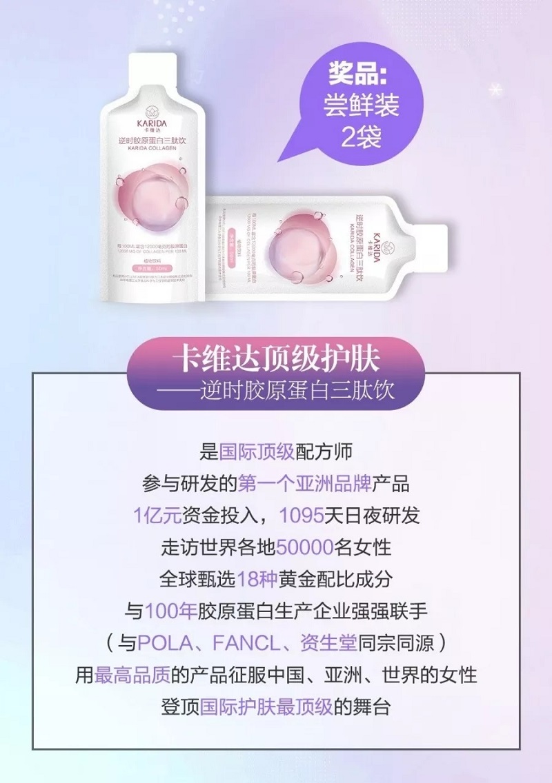 更加激动人心的是,最终的歌王争夺之赛于3月29日开战,卡维达集团诚邀各位观众一起观战,只要竞猜成功,立即赠送卡维达胶原蛋白三肽饮。这款产品是国际顶级配方师参与研发的第一个亚洲品牌产品,以其高品质荣登国际顶级护肤舞台,此次卡维达集团将向幸运观众倾情赠送,期待您的加入!