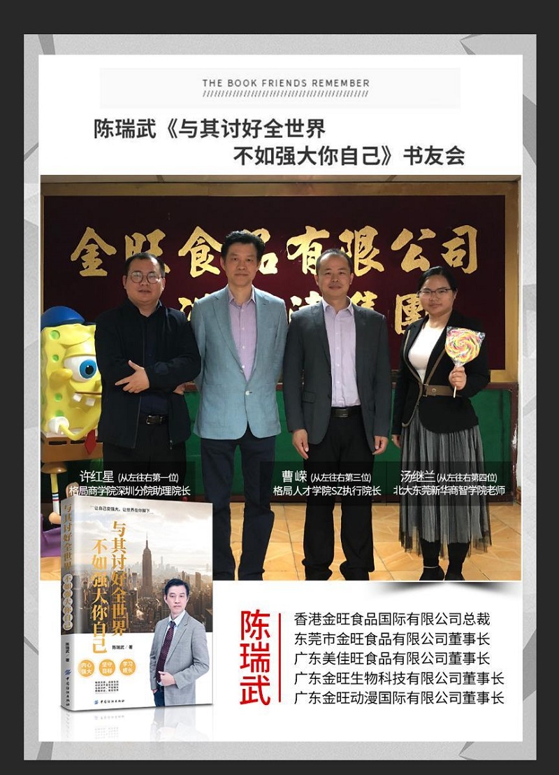 陈瑞武老师相信,依靠多方力量的共同努力,金旺集团一定能够在食品行业里不断开拓新的领域,融合先进的生产模式,推动企业进入快速发展的轨道之中,努力达成打造一流品牌的企业目标,创造更多辉煌成就!